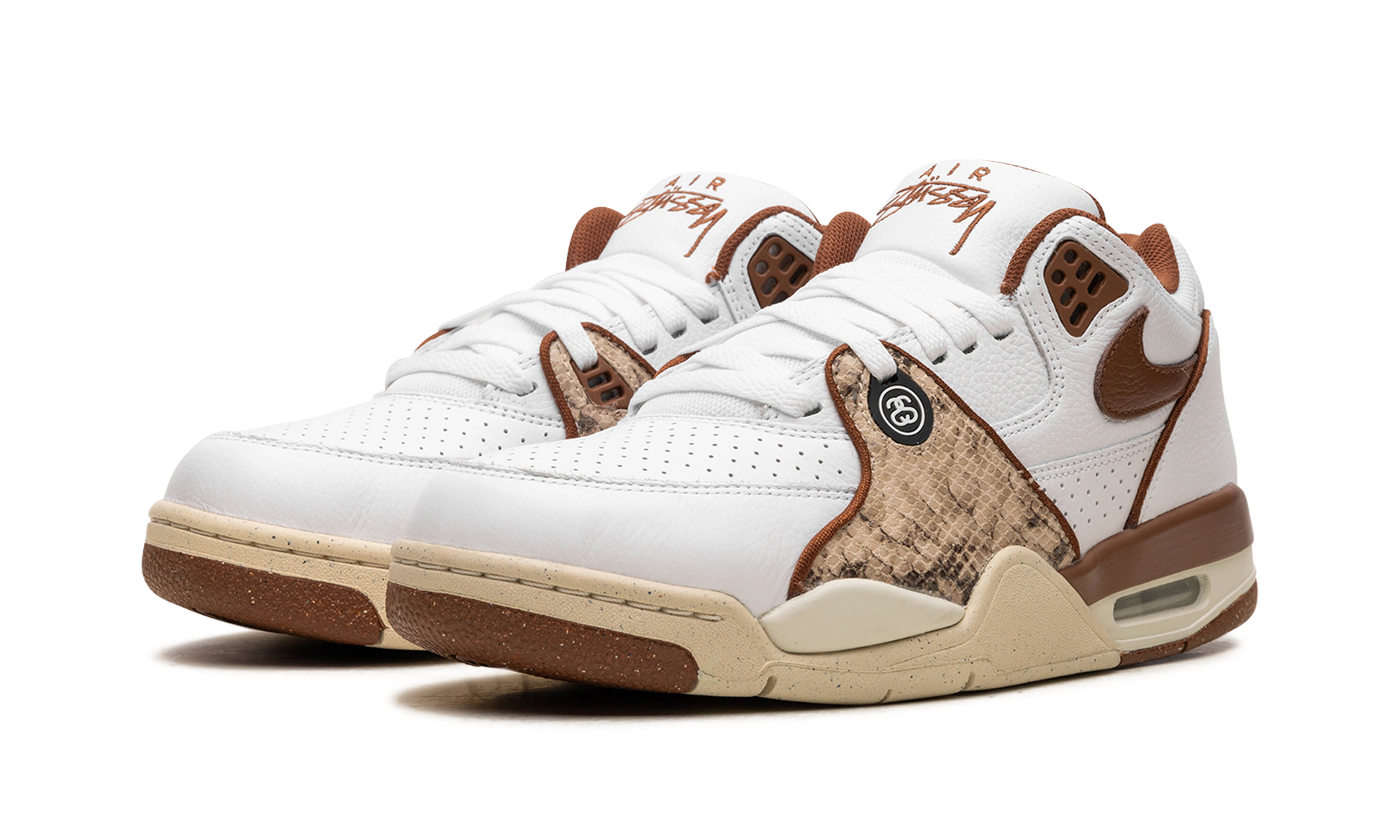 The Stussy x Nike Air Flight '89 Low "Pecan" is a collaboration by the legendary streetwear brand and Nike on a colorway of the retro basketball sneaker with unique design features. Originally released as a performance basketball shoe in 1989, the Air Flight ‘89 is considered an all-time classic Nike Basketball design. One of three colorways from Stussy’s 2023 collection, the “Pecan” features a white leather upper and a brown leather Swoosh. Additional brown accenting can be found on the piping that surrounds the heel and forefoot overlays, and on the molded eyelets and inner lining. A faux snakeskin pattern appears on the forefoot panel. Branding elements include “Stussy Air” on the tongue and Stussy’s signature “SS” emblem on the lateral forefoot. The midsole is designed with an aged look as an homage to the shoe’s ‘80s basketball roots. Release date: December 8, 2023