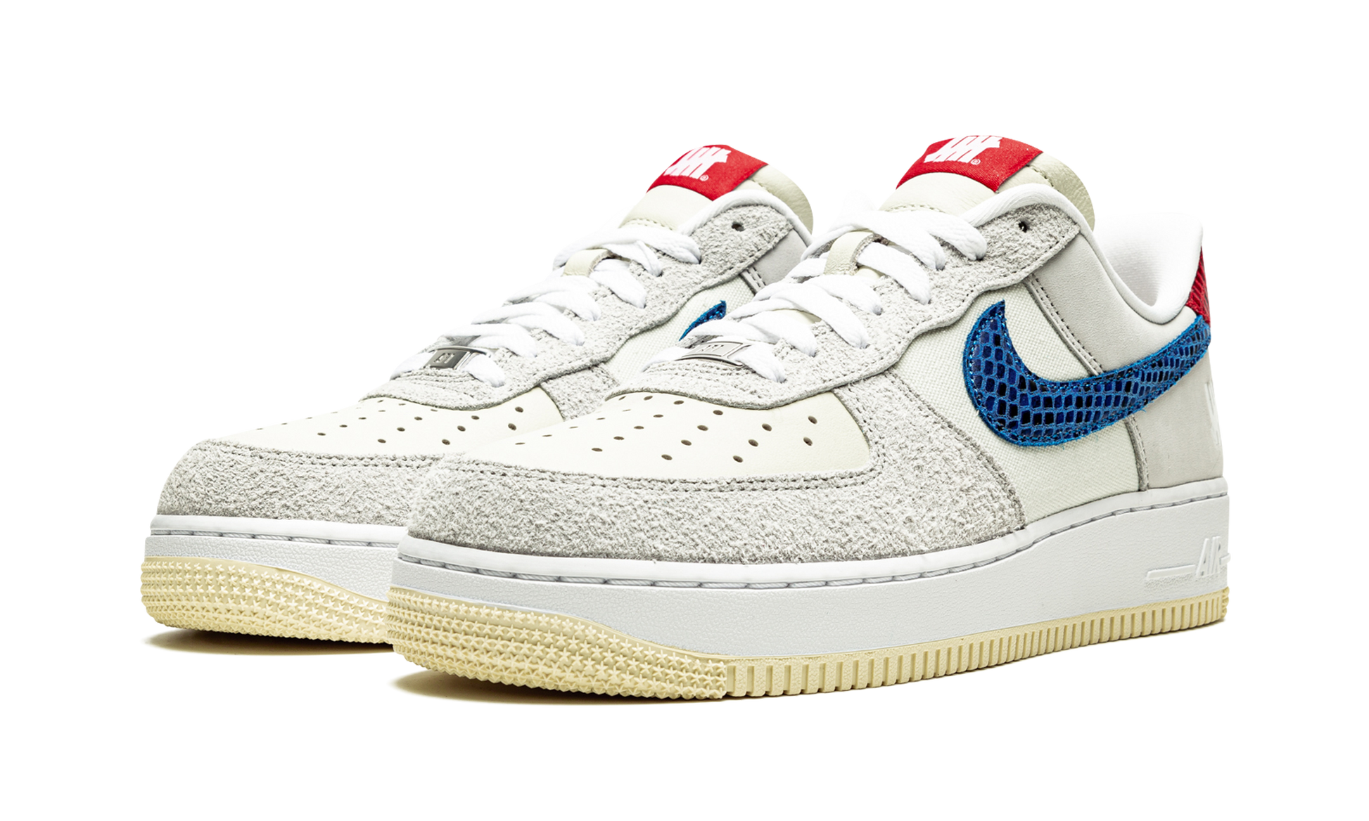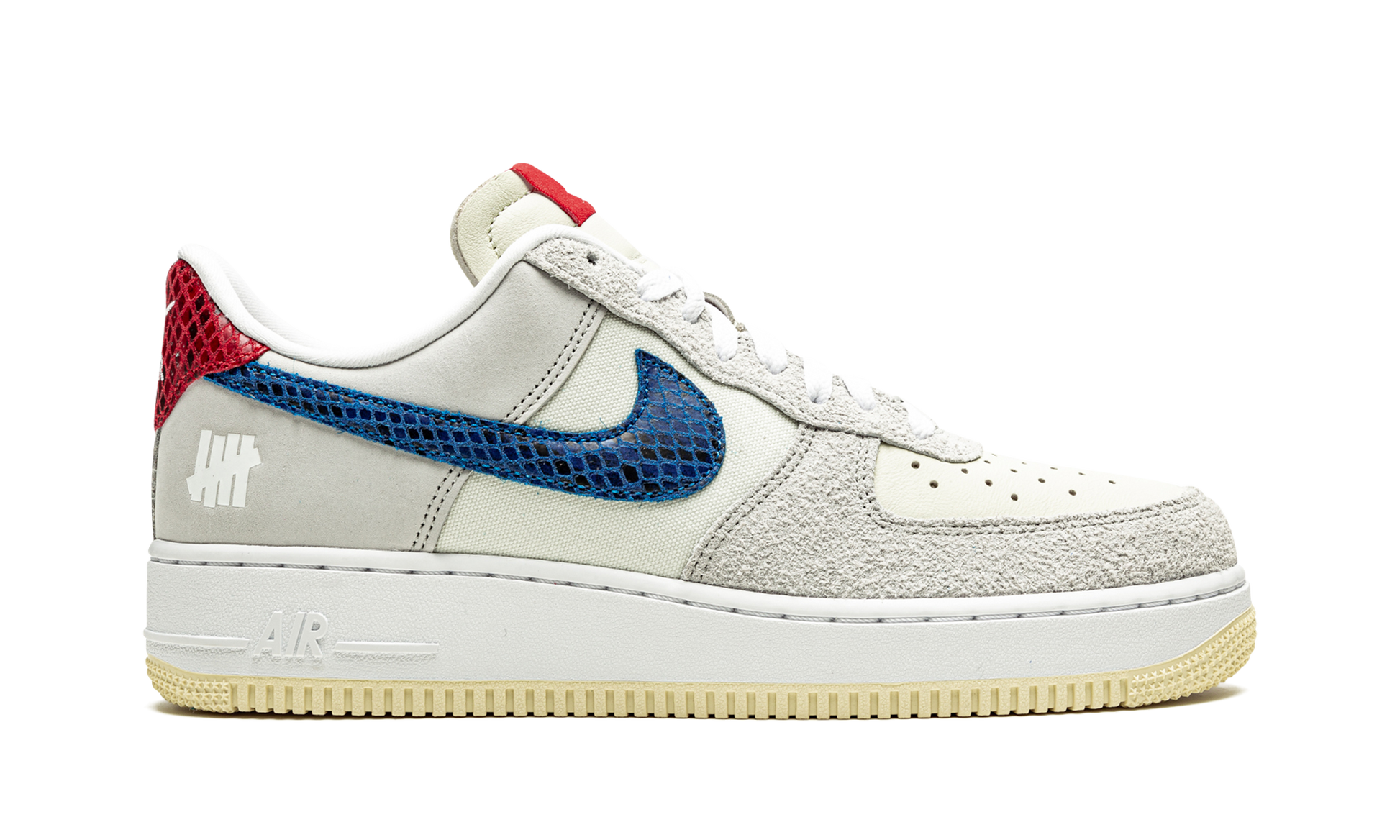 The Undefeated x Nike Air Force 1 Low “5 On It” is a collaboration between the California based sneaker boutique and Nike on the vintage basketball shoe that displays five unique materials on its design. An August 2021 release by the longtime collaborators, the “5 On It” has a blue snakeskin Swoosh and a red snakeskin heel tab. The eyelet panels appear in grey suede, the mid-panel comes in Sail canvas, and the perforated toe is cast in cream leather. Undefeated’s “5 Strikes” logo can be found on the orange nylon tongue tag. Finishing touches include a white rubber midsole with "Air" on the heel paired with a contrasting cream-colored outsole. Release date: August 20, 2021