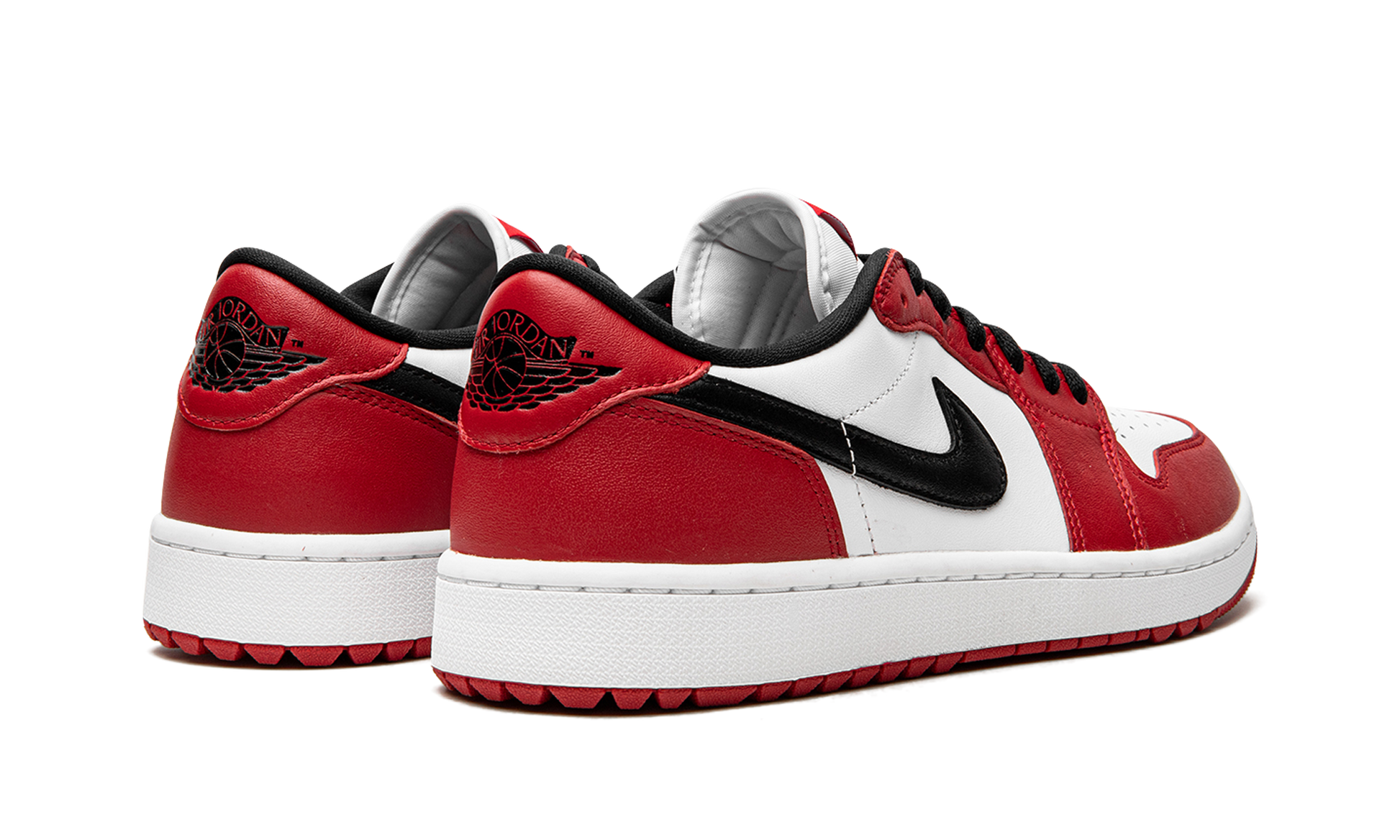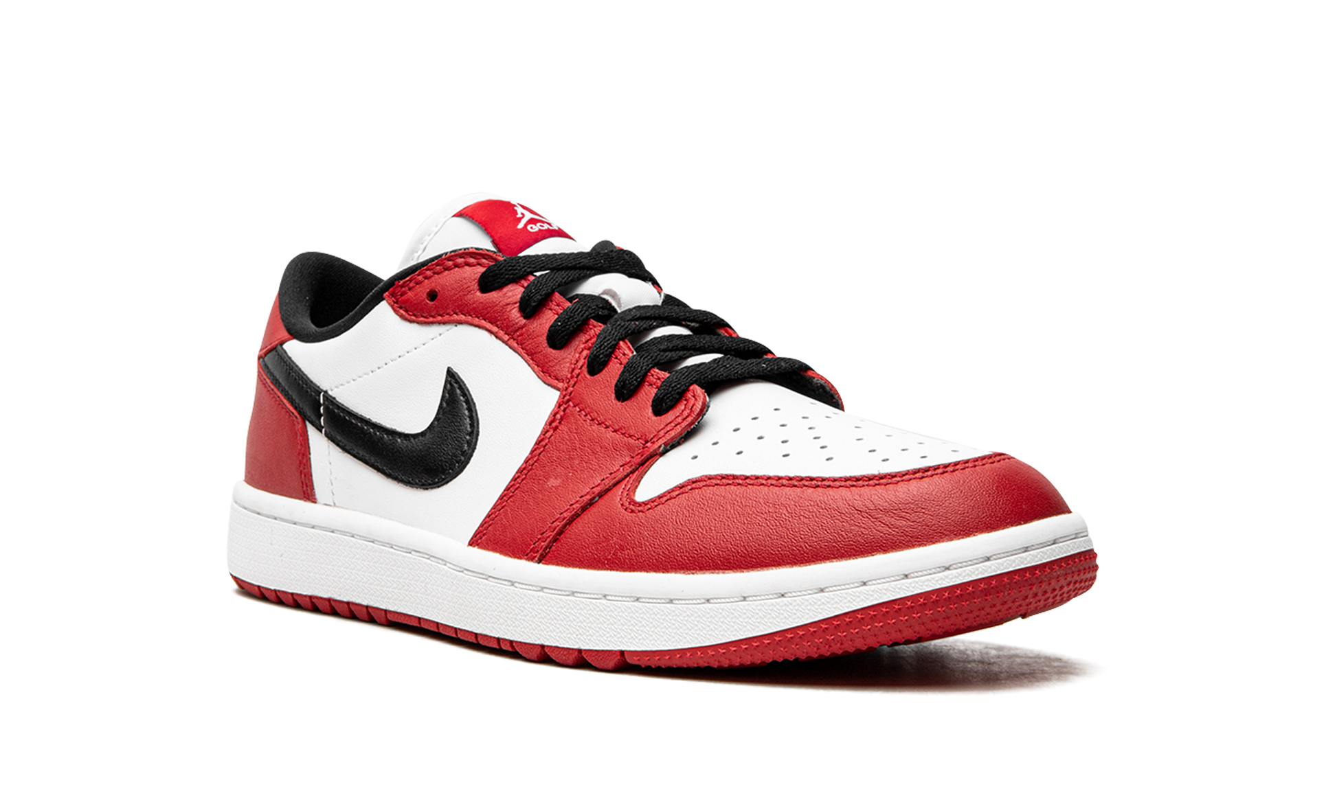 The Air Jordan 1 Low Golf “Chicago'' utilizes the iconic Chicago colorway in low top form to make golfers worldwide look fly on the fairways. The “Chicago” Jordan 1 for golf features a white leather base with Varsity Red overlays and a revamped rubber outsole. The Swoosh is seen in black along with the laces, as well as the Jordan Golf branding on the tongue tag and debossed Wings logo on the heel tab. White is used on the midsole and the red outsole features rubber teeth for traction on the golf course.