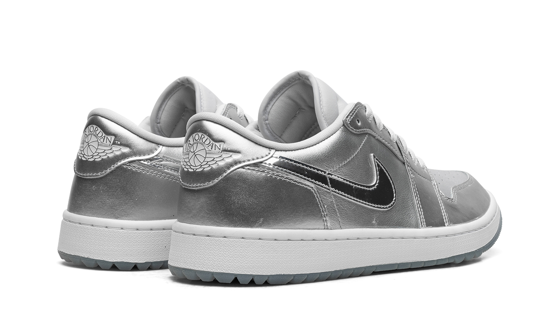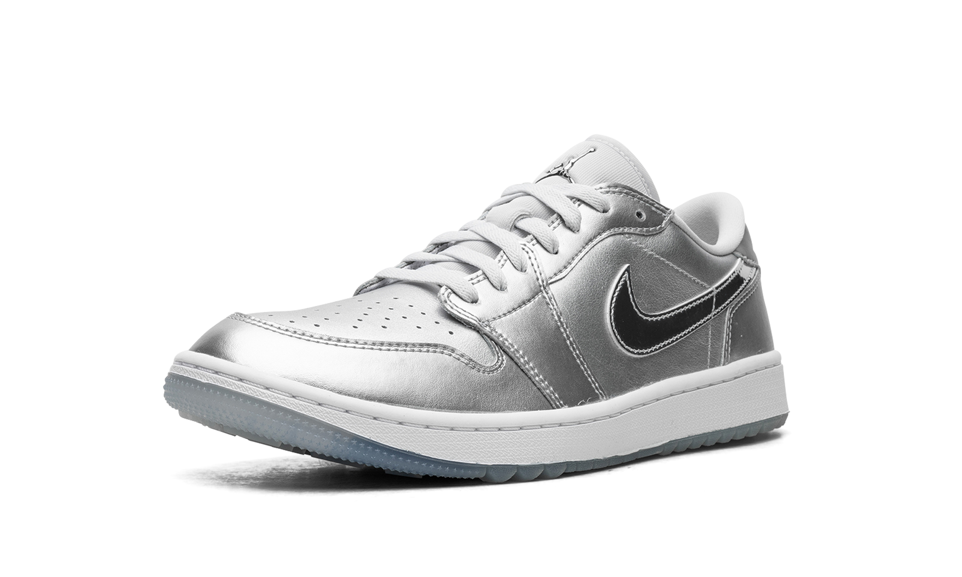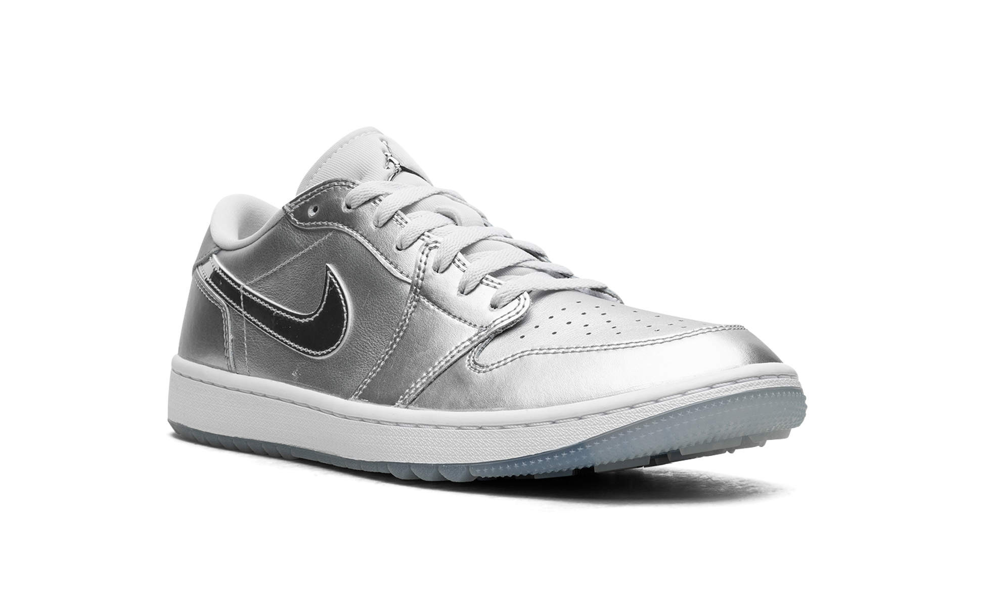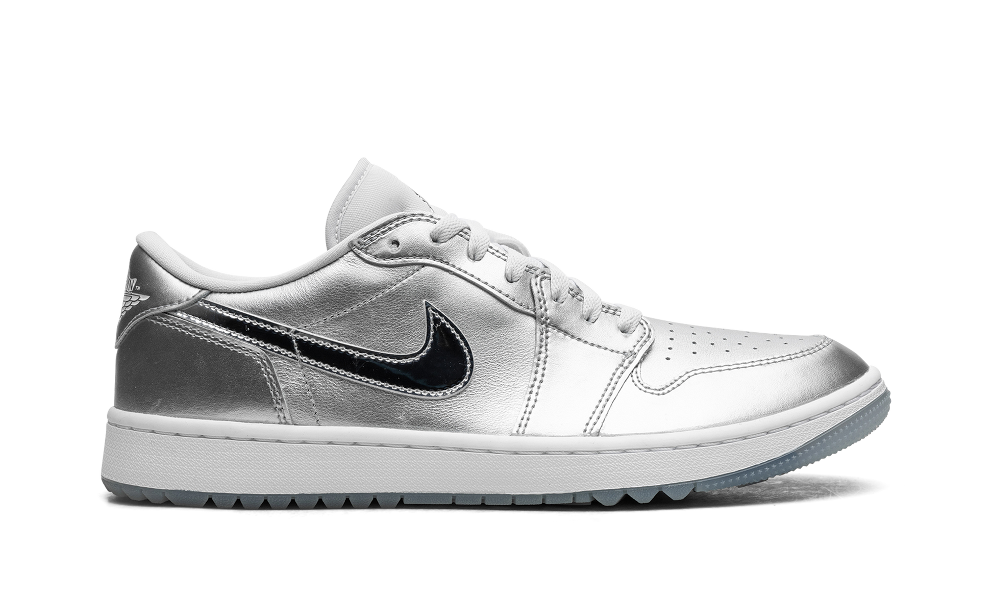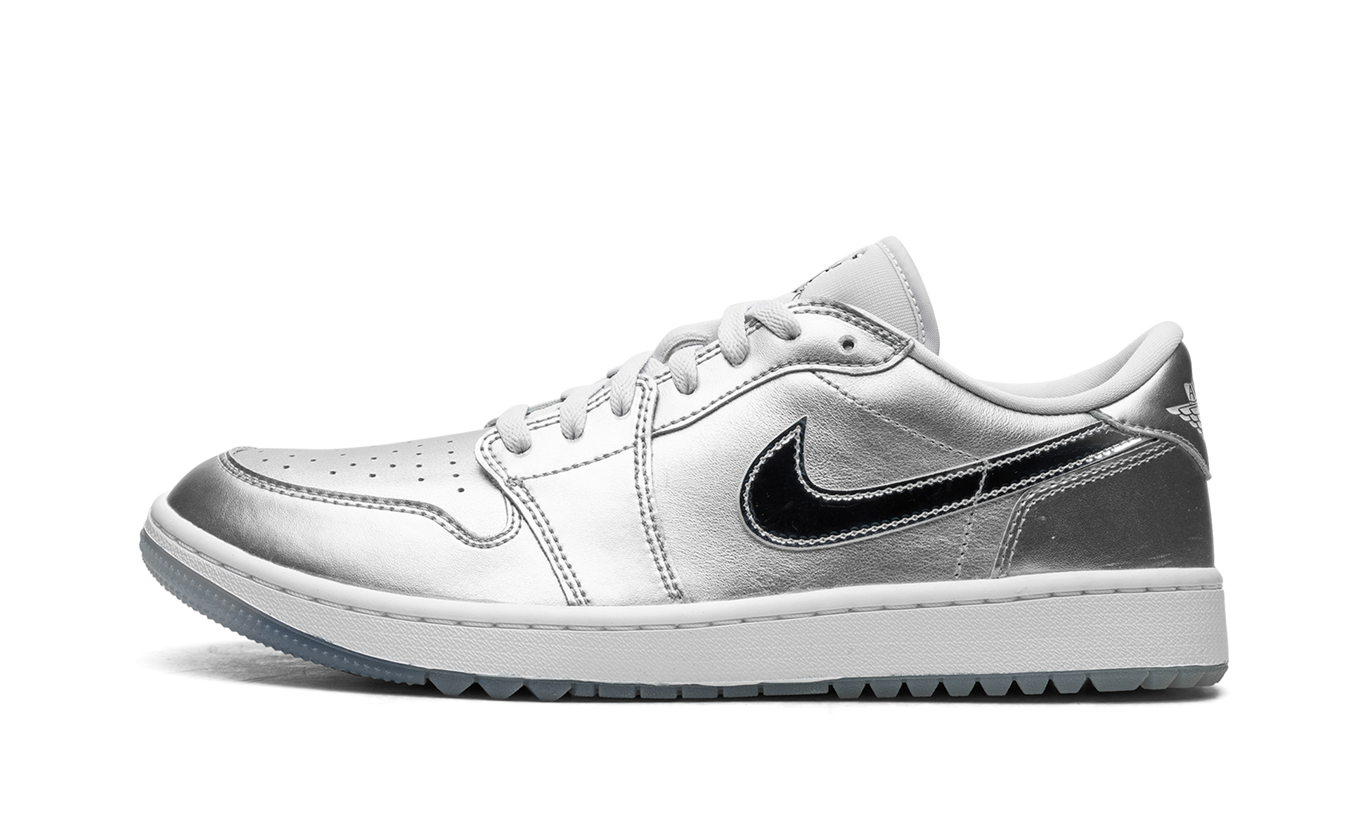 The Air Jordan 1 Low Golf "Gift Giving" is a colorway of the alternate version of the retro basketball shoe made for the golf course with an eye-catching, silver-based look. Loosely inspired by the Jordan 1’s “Tokyo” colorway that surfaced as part of Nike’s former “Concept Japan” or “Co.Jp” collection from the early 2000s, the “Gift Giving” features Metallic Silver accents throughout its design, with the flashy silver hue appearing on the base and overlays. A white leather Swoosh can be found on either side of the shoe. A “Wings” logo appears on the heel and a Metallic Silver Jumpman emblem is found on the tongue. Underfoot, a white rubber midsole and icy blue translucent outsole with small nubs completes the look. Release date: November 17, 2023