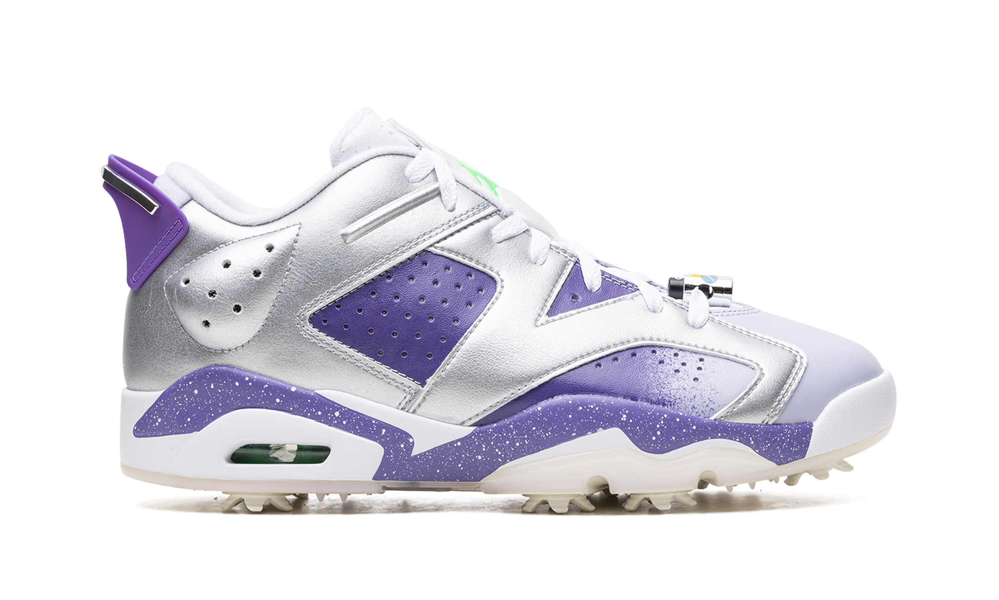 The Air Jordan 6 Low Golf "U.S. Open" is the alternate golf version of the sixth Air Jordan that celebrates the PGA Championship. The Jordan 6 Low Golf “U.S. Open” features a purple airbrush effect with Metallic Silver leather overlays throughout the design. A silver Jumpman is embroidered on the back of the shoe while a neon green Jumpman is embroidered on the tongue overlay. The mid-panel is painted purple with white speckle detailing. Underfoot, nubs on the outsole provide traction on a golf course. Release date: June 16, 2023