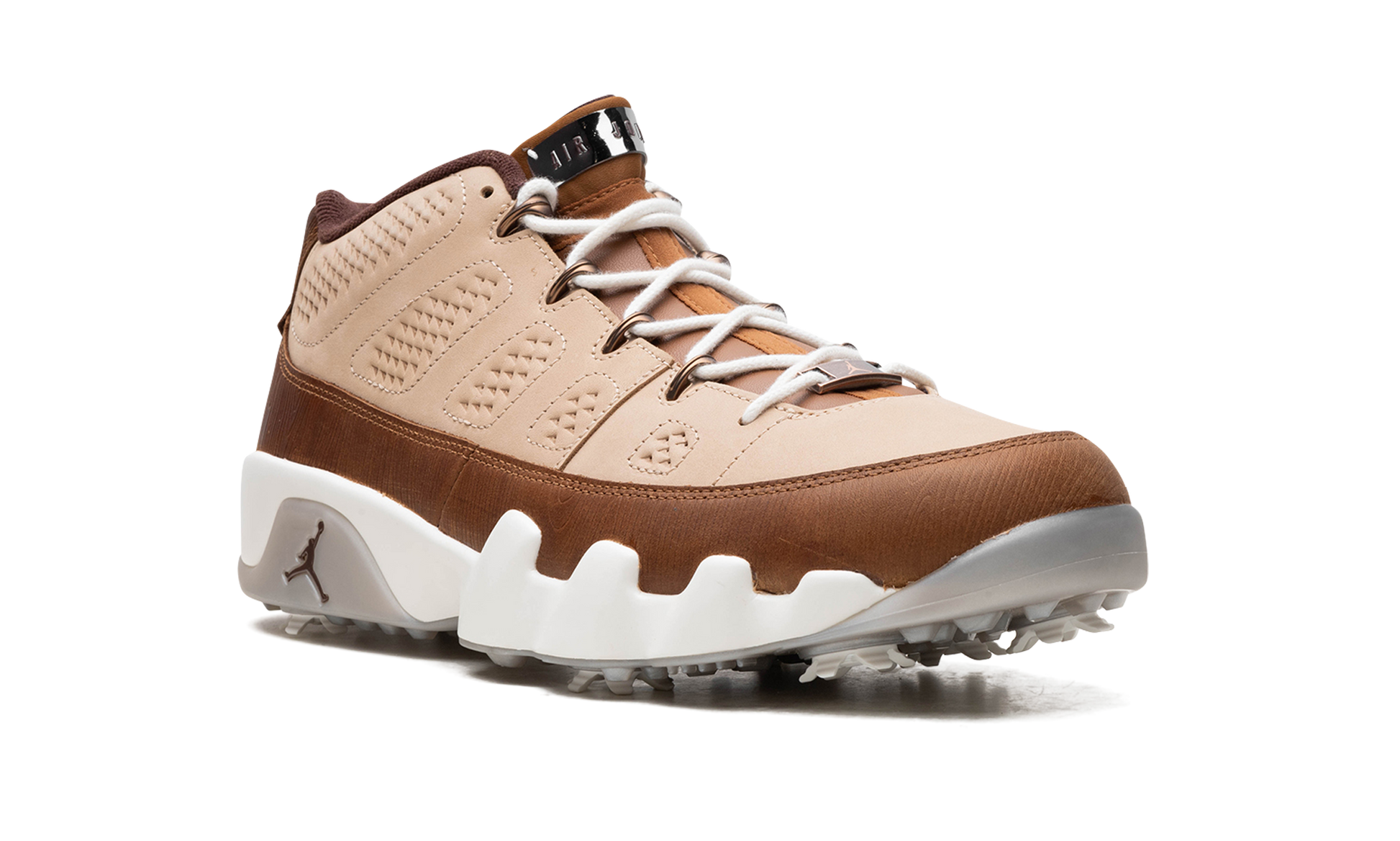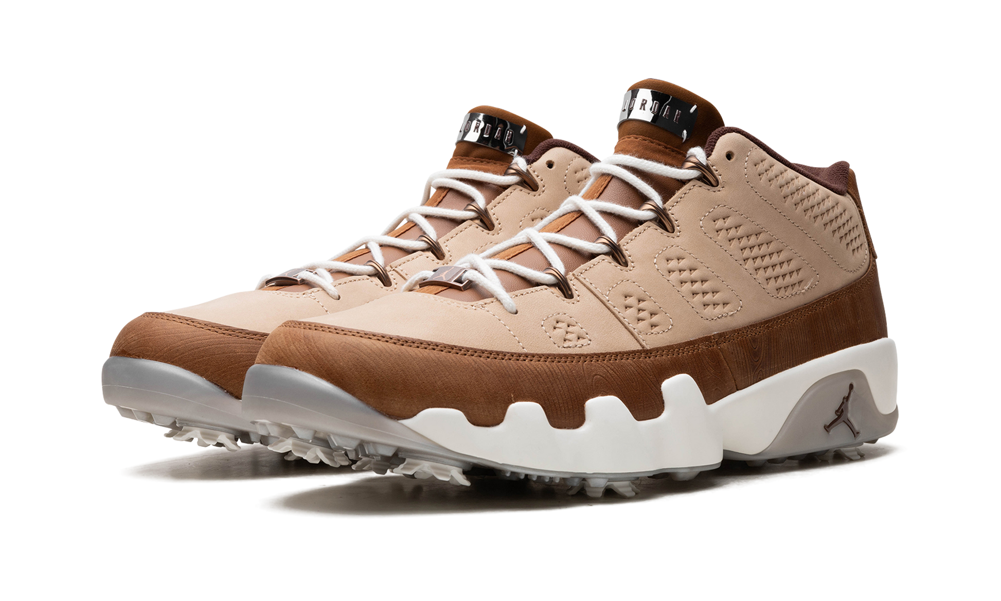 The Air Jordan 9 Low Golf "Masters" is a colorway of the golf version of the retro basketball shoe that nods to the storied golf championship tournament. The Jordan 9 Golf features modifications for the fairway, including rubber spikes on the outsole that provide traction. The “Masters” colorway honors the prestigious PGA “Masters” tournament with a light tan suede base and a dark brown leather mudguard with a woodgrain textured finish. A metallic “Jordan” nameplate appears on the tongue, adding to the shoe’s luxury appeal. Underfoot, spikes on the outsole provide traction on the golf course. Release date: April 2024