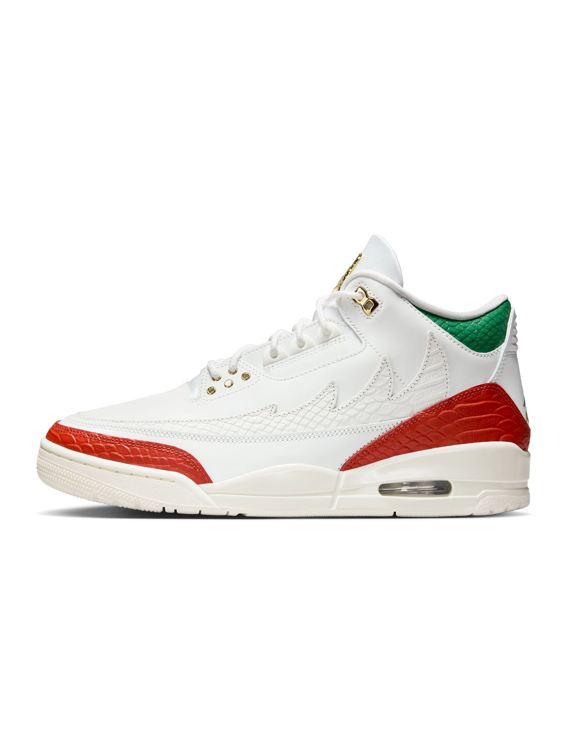 Take flight with the Air Jordan 3 Retro "El Vuelo", a bold tribute to Mexico City’s cultural heritage and the high-flying spirit of lucha libre. Textured and shiny leather overlays channel the look of luchador masks, accented in the colors of the Mexican flag. Special packaging designed like lucha libre posters adds to the celebration, making this release a true collector’s item.