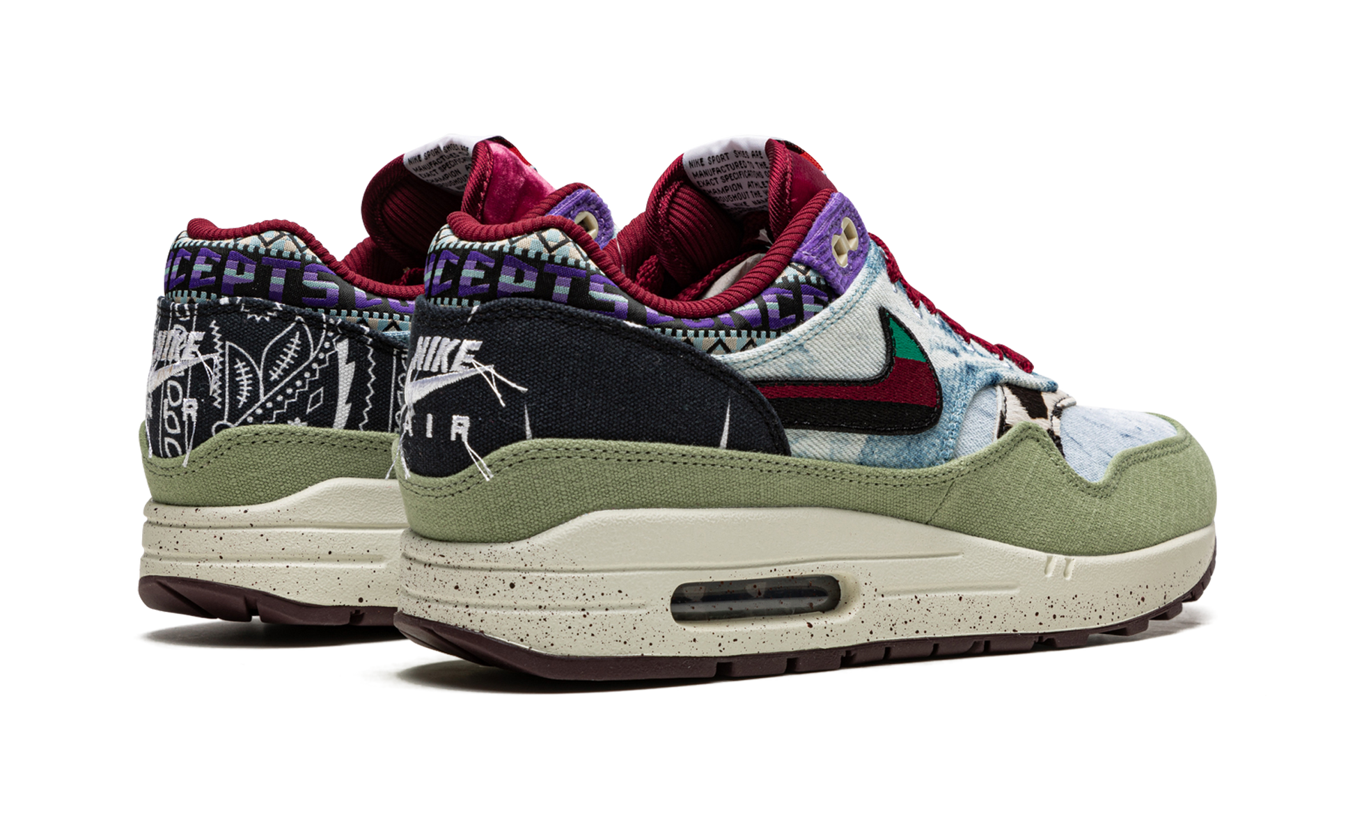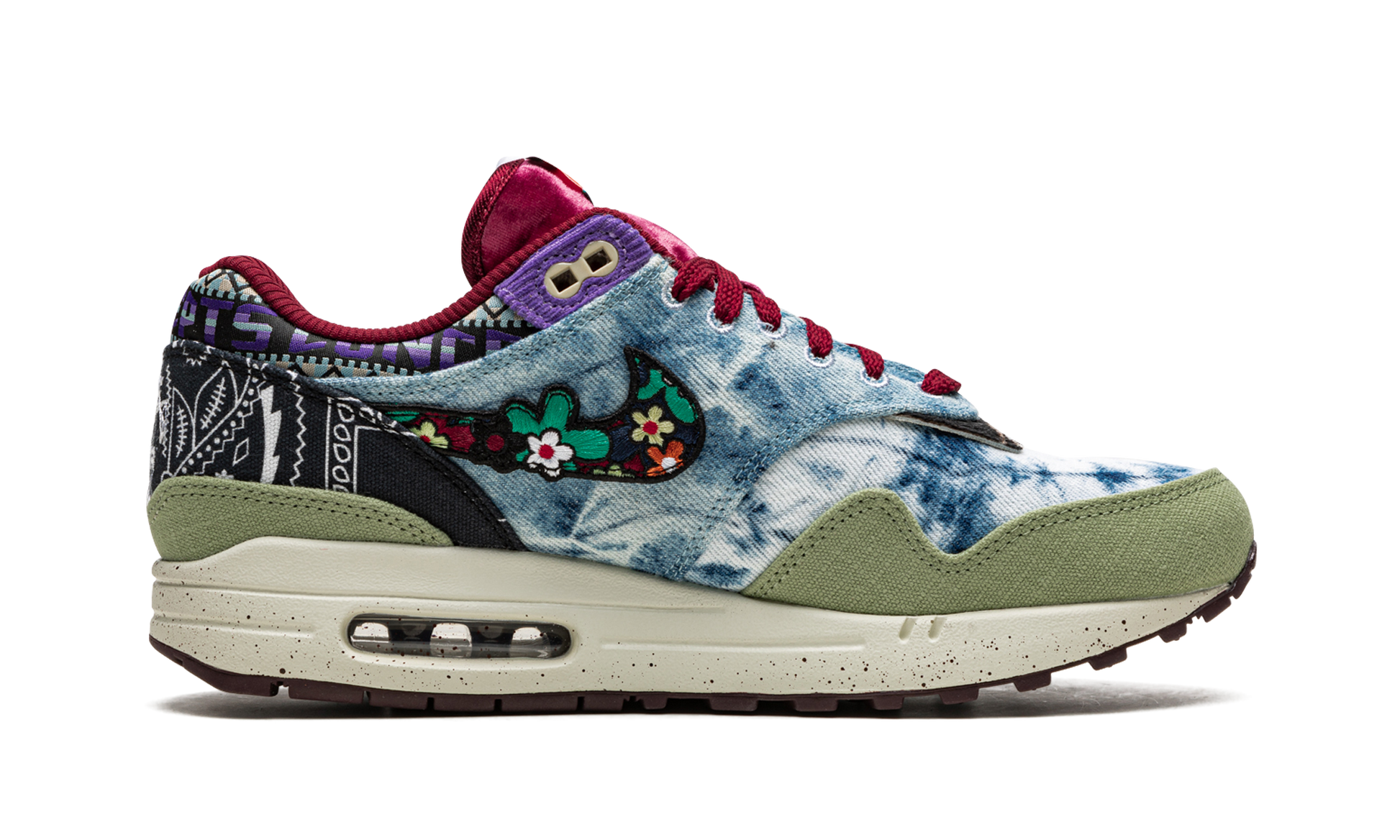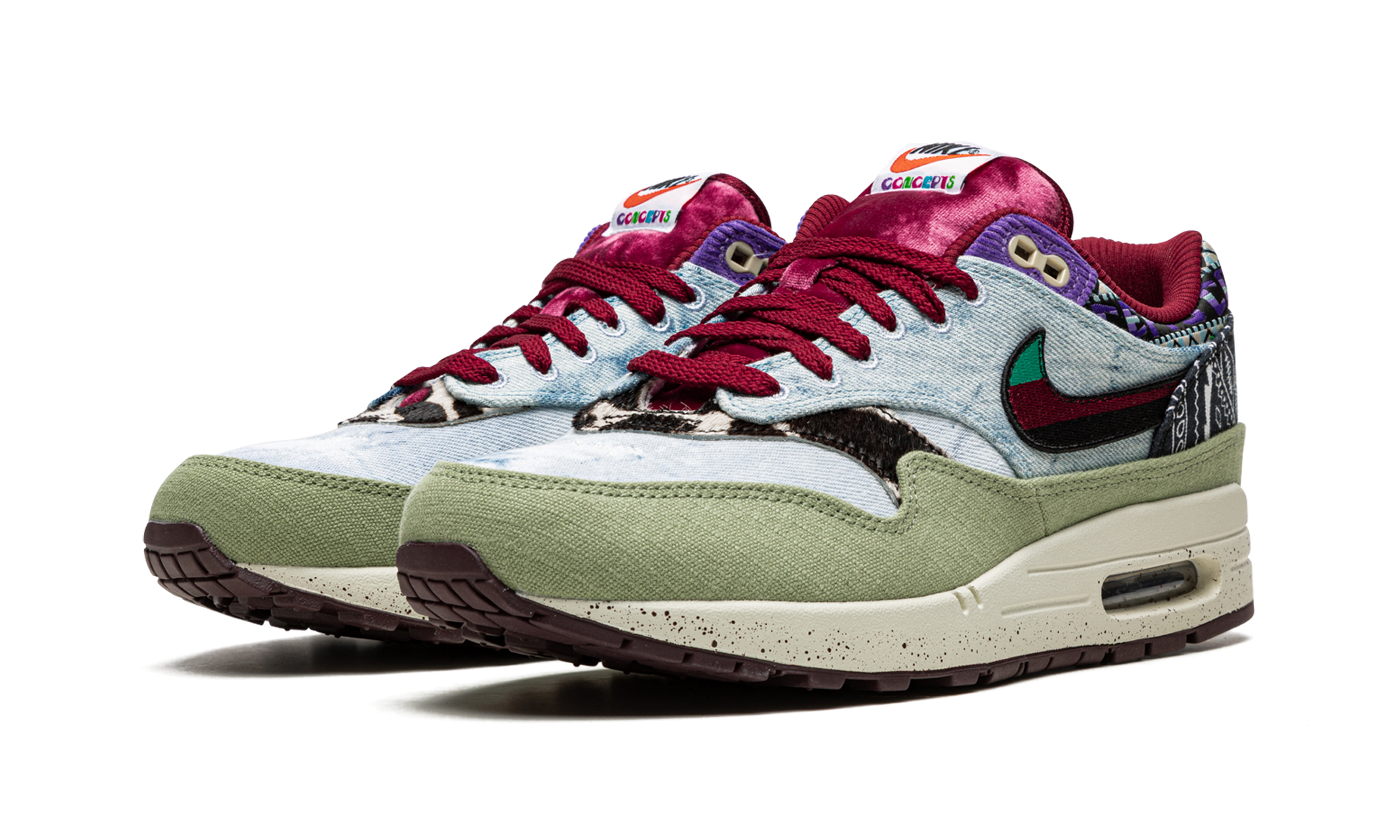 The Concepts x Nike Air Max 1 “Mellow” is a collaboration between the Boston based sneaker boutique and Nike on the vintage running shoe in a colorway inspired by 1960s and 1970s youth culture. The “Mellow” colorway draws favorably from the era’s music festivals, specifically the ‘69 Harlem Cultural Festival, which was headlined by the likes of Stevie Wonder, Nina Simone, and many more. The unique fashion worn by the festival’s headlining acts and concert goers informs the eye-catching bandana, cowhide, denim, and woven materials found on the “Mellow’s” design. Velvet accenting, frayed edges, and a multicolor Swoosh accentuate the shoe’s “flower power” design ethos. Release date: March 5, 2022