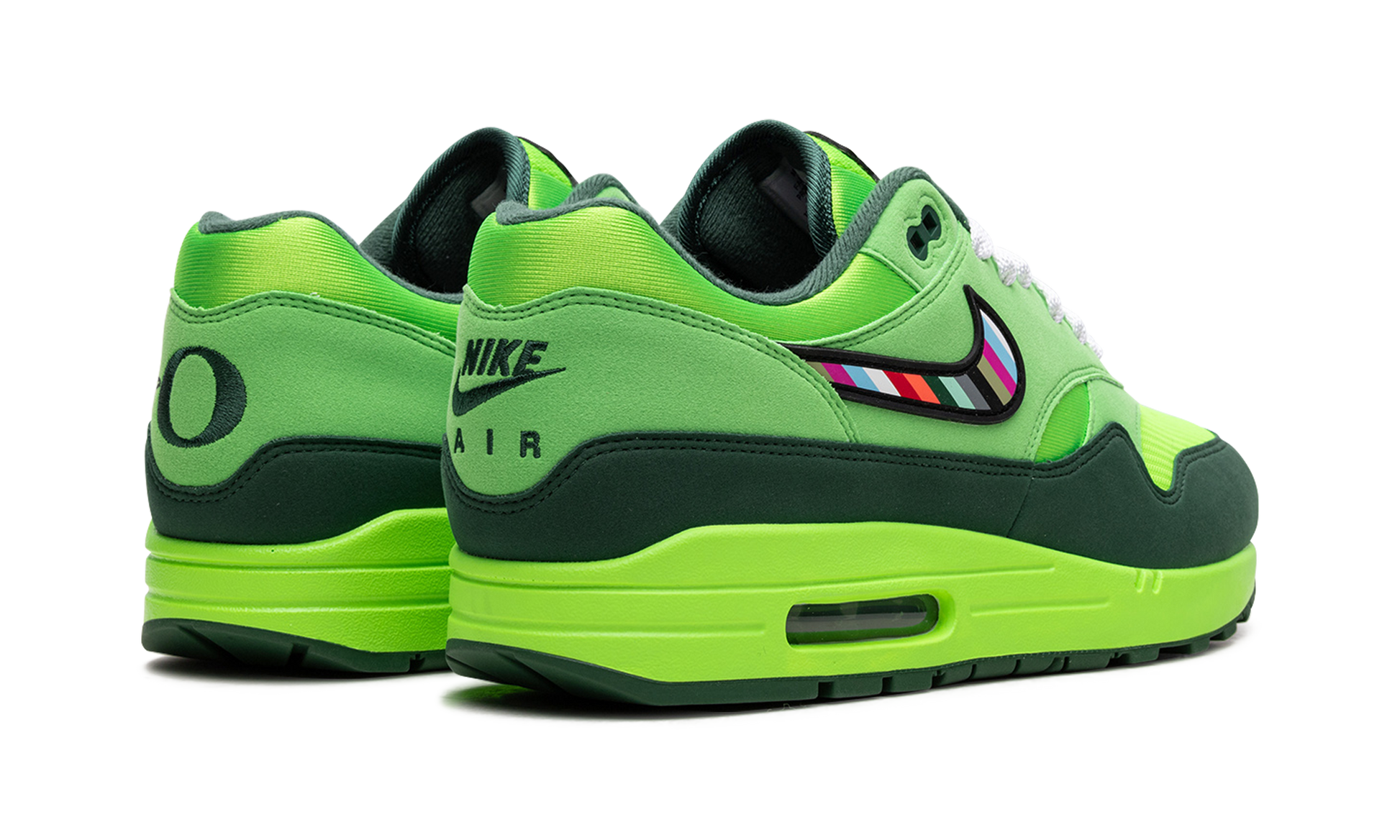 The Tinker Hafield x Nike Air Max 1 “Oregon” PROMO is an unreleased sample version of the collaboration by Phil Knight’s Division Street NFT collective and the legendary footwear designer on a colorway of the classic shoe inspired by the Oregon Ducks. Designed to help launch Ducks of a Feather, an NFT platform created to empower University of Oregon student athletes and connect them to fans, boosters, and collectors, the Air Max 1 “Oregon” has a decidedly Ducks-flavored look. The upper features a neon green mesh construction contrasted with bright lime green and dark green felt overlays. A multicolored Swoosh appears on each side of the shoe. Tinker Hatfield’s signature is seen on the lateral side of the heel. Each pair is hand-numbered out of 120, which is written on the heel below Tinker’s signature. The Ducks’ school mascot is seen on the tongue in a multi-color design.