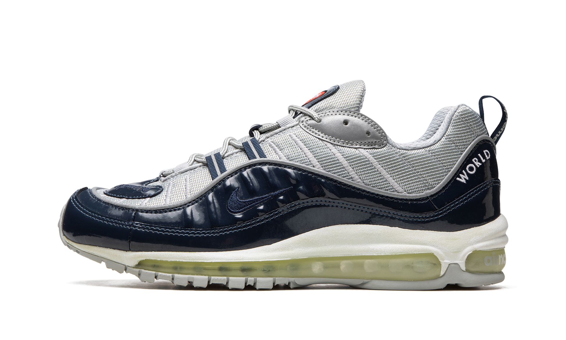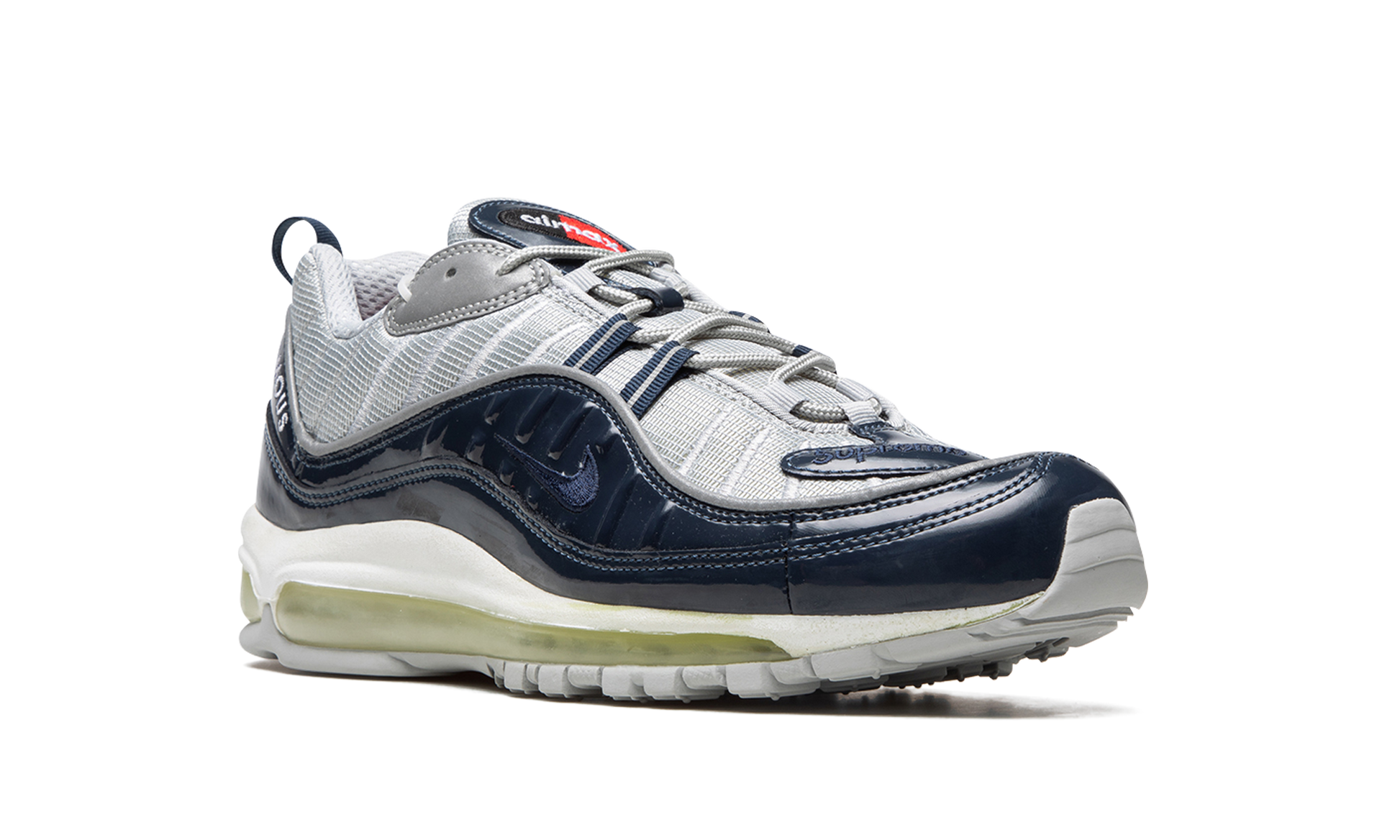 In 2016 Supreme teamed up with Nike for a collaboration on an unexpected model, the Air Max 98. With a total of four colorways, this version features an Obsidian blue patent leather upper with reflective silver accents.