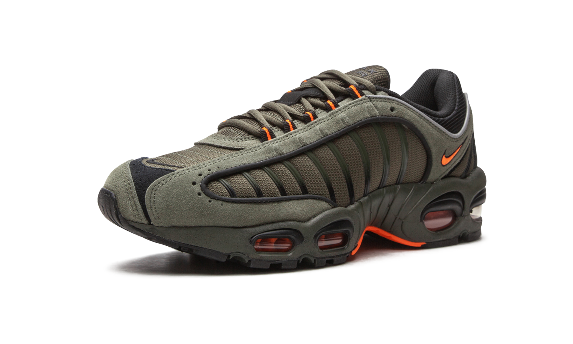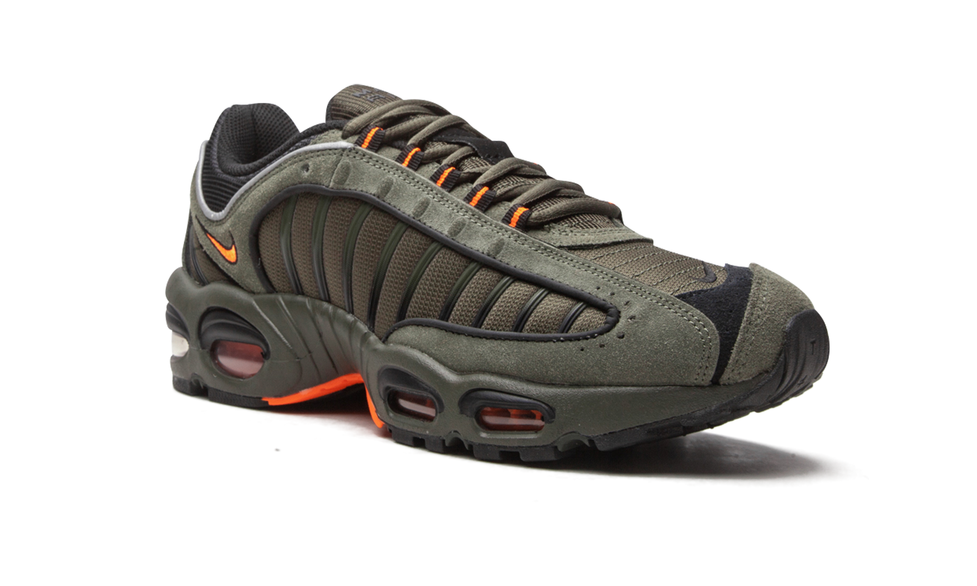 The Nike Air Max Tailwind 4 “Flight Jacket” is a military-inspired colorway of the retro running shoe that was released in Summer 2019 by Nike. Reminding many of Undefeated’s incredibly rare Air Jordan 4 collaboration from 2005, this “Flight Jacket” edition of the Air Max Tailwind 4 also borrows graciously from rugged military aesthetics, and the results are clearly favorable. Both the model’s mesh base and suede overlays are dressed in a dark olive green hue commonly associated with military gear. An orange embroidered Swoosh appears on the lateral side and olive “Max Air” detailing on the black synthetic heel overlay. Black mesh can be found on the collar and olive green mesh appears on the tongue. The black nylon eyestays feature orange accenting for a subtle pop of color. Underneath, orange-tinted visible Air bubbles in both the forefoot and the heel finish off the look.
