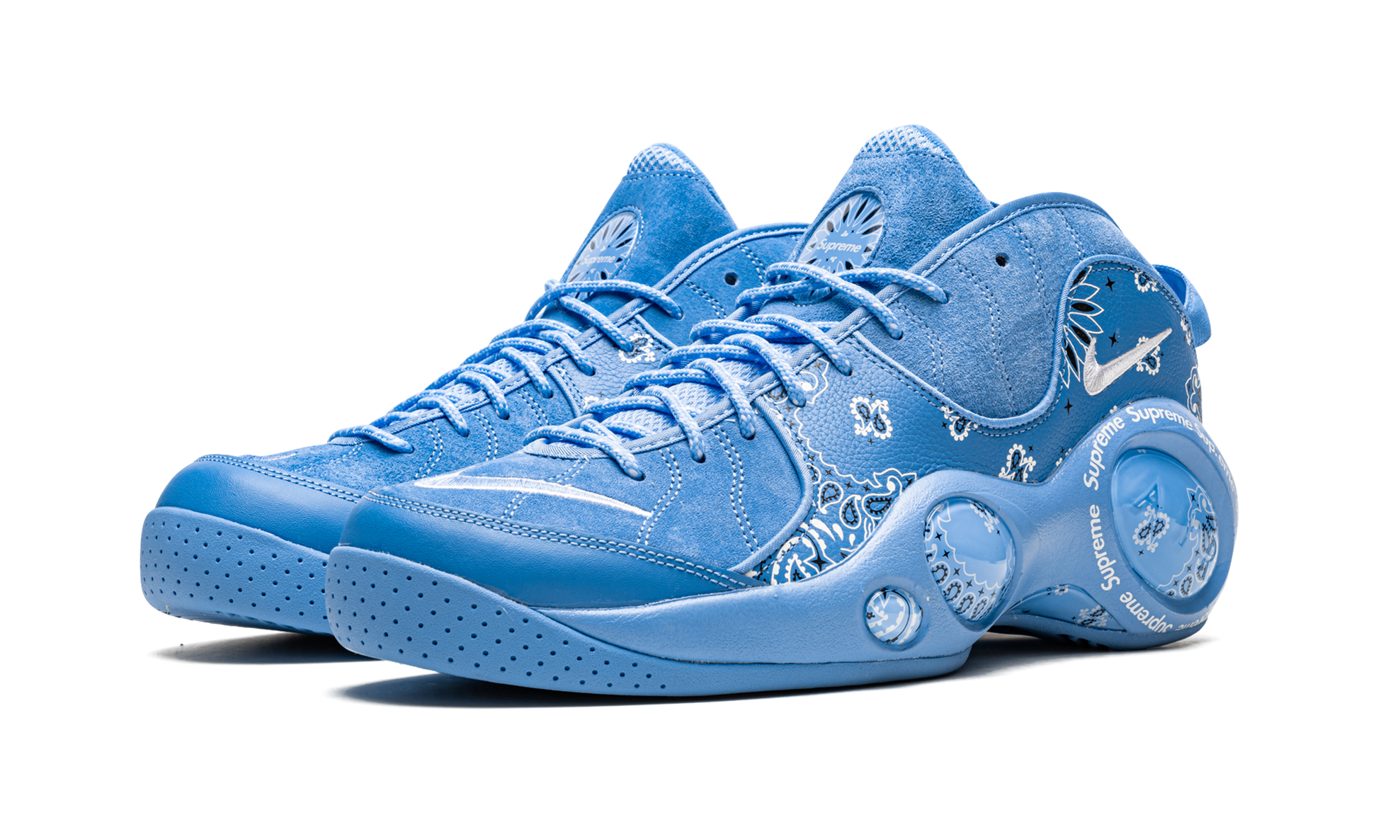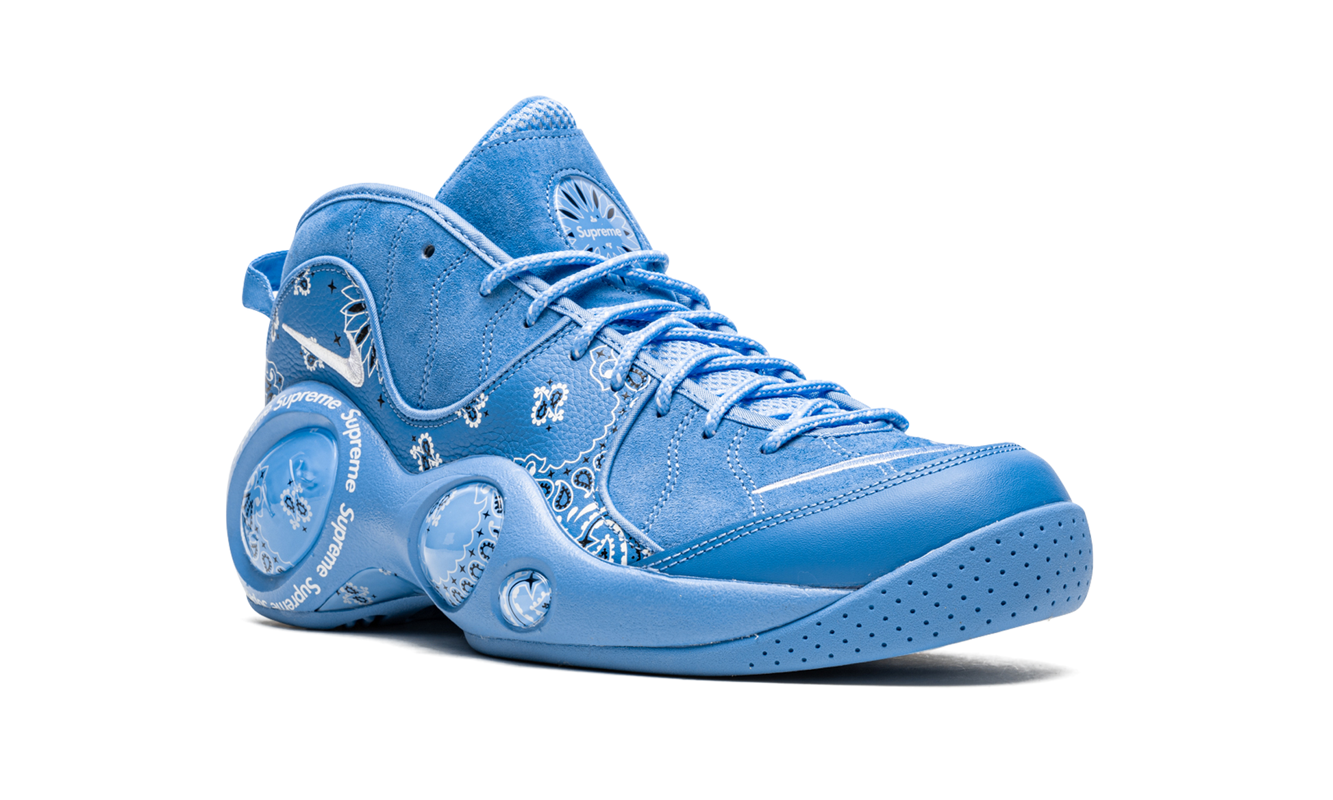 The Supreme x Nike Air Zoom Flight ‘95 SP “University Blue” is a collaboration between the “World Famous” streetwear brand and Nike on the retro basketball shoe that first released in 1995. One of three colorways of Air Zoom Flight ‘95 designed by Supreme for its Spring/Summer 2022 collection, the “University Blue” is reminiscent of the North Carolina Tar Heels college basketball team colors with its monochromatic light blue appearance. The shoe features a University Blue suede base with tonal leather overlays with a paisley prints throughout. A white leather Swoosh is found on the collar and a tonal Swoosh appears on the toe. The paisley pattern appears on the shoe’s oversized oval “windows” on the midsole. Release date: May 5, 2022