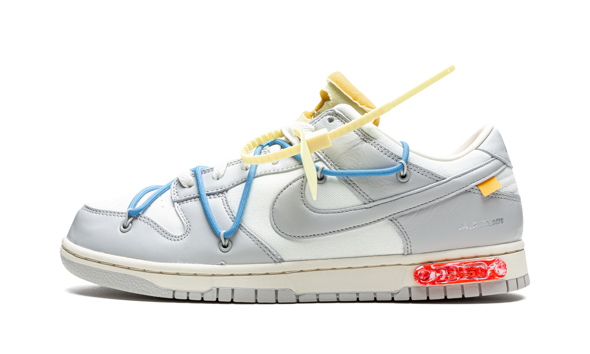 The Off-White x Nike Dunk Low “Lot 05/50” is one of several colorways of the vintage low-top basketball shoe created by Virgil Abloh and Nike in 2021. The contingency’s “Lot 50” collection on Dunks succeeds Off-White and Nike’s “The 10” series from 2017, one of the most groundbreaking sneaker collaborations ever released. On “Lot 5,” Sail canvas is found on the perforated toe, mid-panel, and collar. Neutral Grey leather appears on the overlays and Swoosh. On the heel, black “Nike” branding contrasts the grey leather heel tab. Off-White’s signature Helvetica text on the medial side and a secondary bungee cord-like lacing system is added to the upper in addition to the traditional lacing design. Underfoot, a marbled red-and-white insert with “Lot 05/50” text completes the look. Release date: August 9, 2021