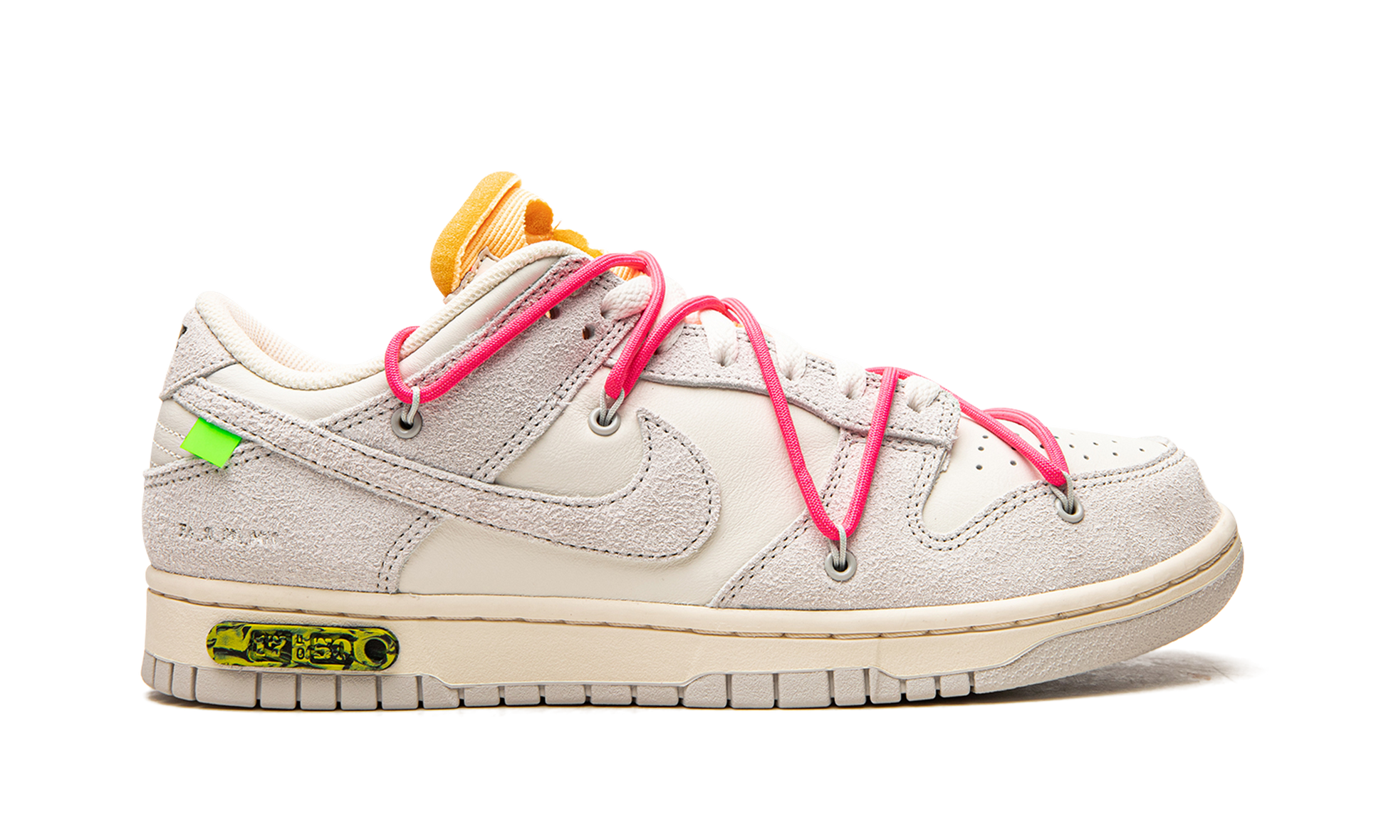 The Off-White x Nike Dunk Low “Lot 17” is one of multiple colorways of the classic low-top shoe created by Virgil Abloh in collaboration with Nike in August 2021. A monumental collection that spans 50 unique colorways of the retro basketball shoe, the Off-White and Nike “Lot 50” line succeeds Abloh’s influential “The 10” collaboration with Nike from 2017. On “Lot 17,” Sail canvas appears on the toe, mid-panel and collar. The overlays and Swoosh are constructed in Neutral Grey leather. Black “Nike” branding is printed on the heel and Off-White’s signature Helvetica text is found on the medial side. A secondary, bungee cord-like lacing system is added to the upper in addition to a traditional lacing setup. The look is carried over from Off-White’s first Nike Dunk collaboration from 2019. A marbled green-and-yellow insert with “Lot 17 of 50” appears on the midsole. Release date: August 9, 2021