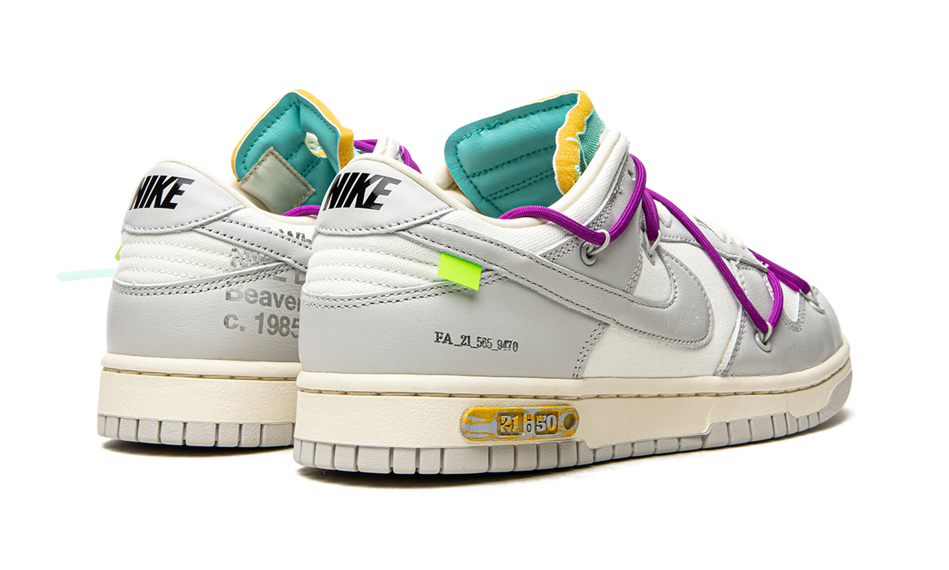 The Off-White x Nike Dunk “Lot 21” is one of fifty colorways of the retro basketball shoe designed by Virgil Abloh for an August 2021 release. The anticipated “Lot 50” collection between Abloh and Nike follows the duo’s “The 10” collaboration from 2017, one of the most influential sneaker collaborations in history. “Lot 21” is constructed with a Sail canvas base with contrasting Neutral Grey leather overlays and Swoosh branding. Black “Nike” detailing is found on the heel. Elsewhere, Off-White’s signature Helvetica text appears on the medial side. A secondary, bungee cord-like lacing system is layered on the upper in purple. The look is consistent with the styling of Off-White’s first Nike Dunk collaboration from 2019. A traditional lacing system on the upper retains the Dunk’s original design. Underfoot, a yellow-and-grey marbled “Lot 21 of 50” insert on the midsole. Release date: August 9, 2021
