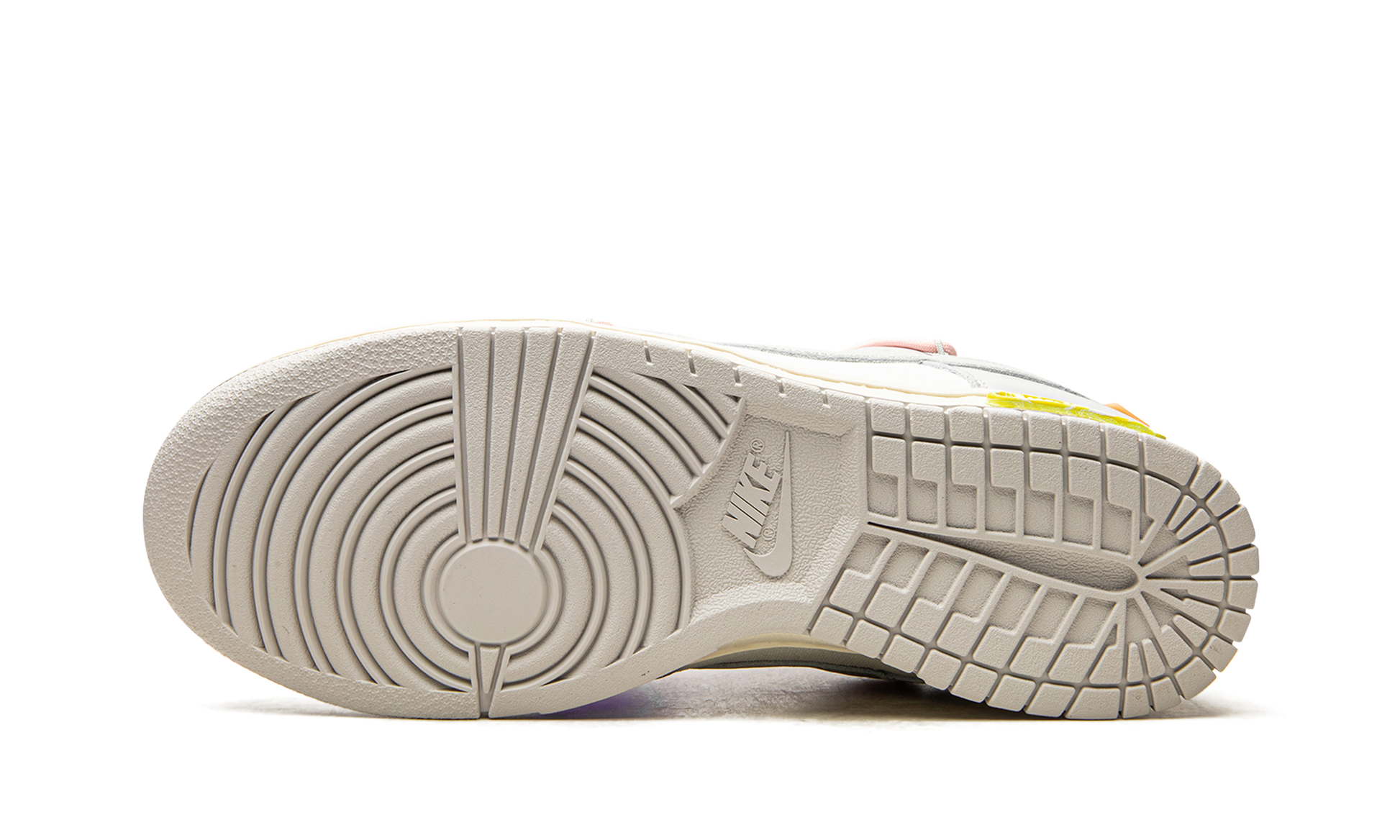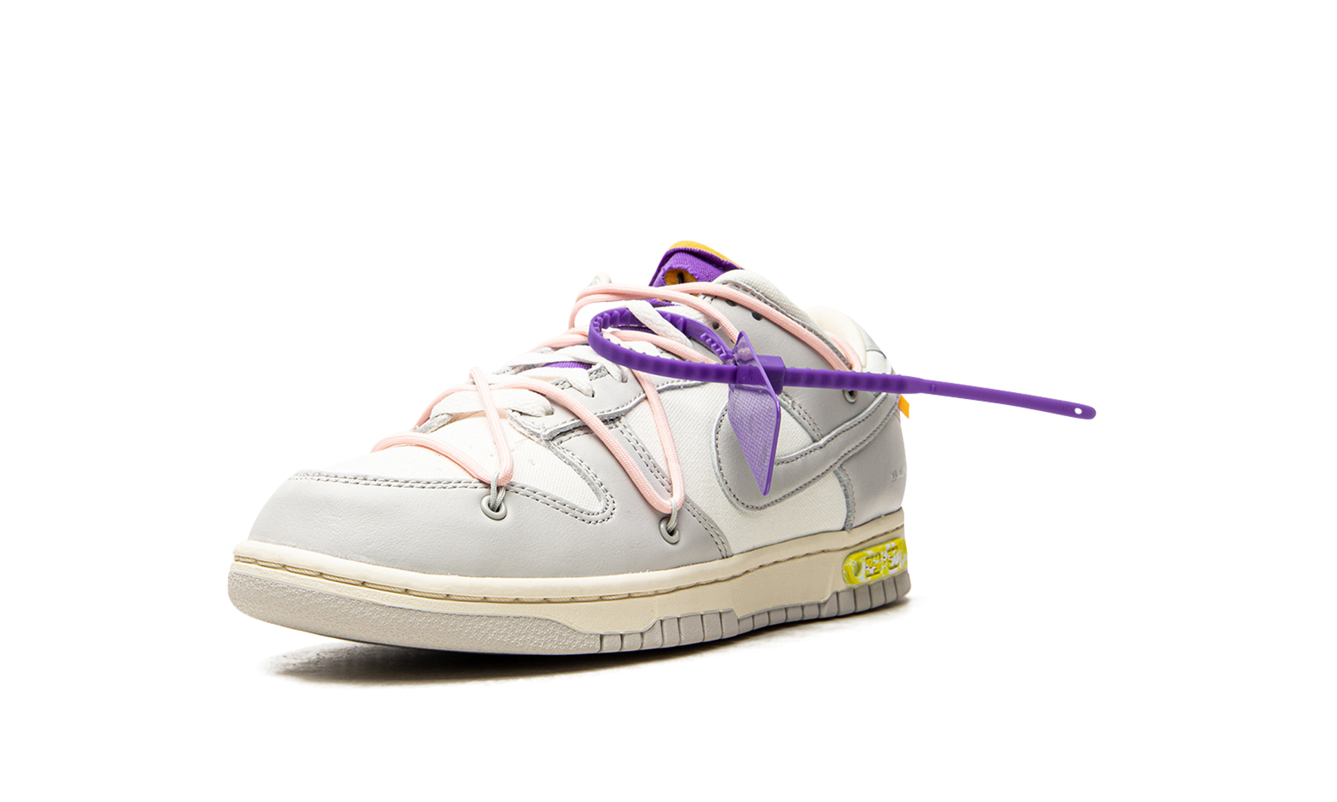 The Off-White x Nike Dunk Low “Lot 24” is one of 50 unique colorways of the classic shoe designed by Virgil Abloh for Nike. The high-profile “Lot 50” collaboration between Abloh’s Off-White streetwear brand and Nike follows the pair’s “The 10” collection from 2017, one of the most coveted sneaker collaborations in history. “Lot 50” imagines the former basketball shoe in 50 different colorways, each with unique detailing. On “Lot 24,” Sail canvas appears on the toe and mid-panel and collar. The overlays and Swoosh are constructed in Neutral Grey leather. Black “Nike” branding is printed on the heel and Off-White’s signature Helvetica text is found on the medial side. A secondary, bungee cord-like lacing system is added to the upper in addition to a traditional lacing setup. The look is carried over from Off-White’s first Nike Dunk collaboration from 2019. A marbled white-and-yellow insert with “Lot 24 of 50” appears on the Sail midsole. Release date: August 9, 2021