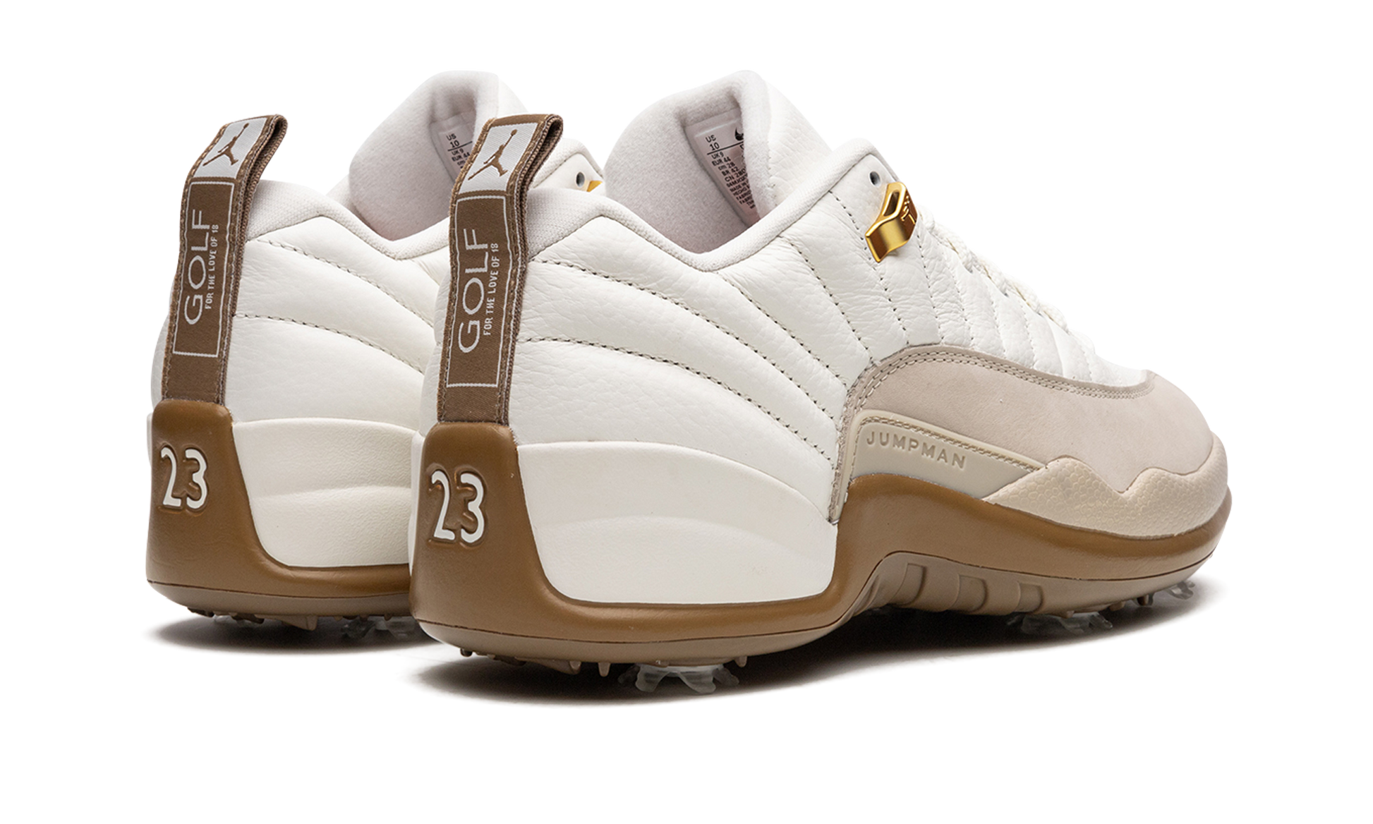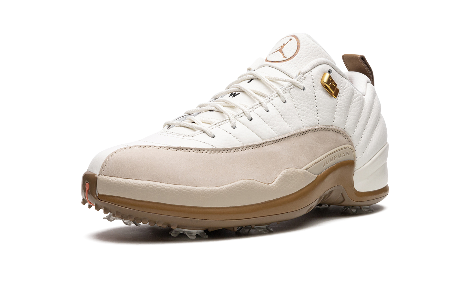The Air Jordan 12 Golf “Driftwood” is an alternate version of the retro basketball shoe designed for the golf course. Jordan Brand’s Jordan Golf collection debuted in 2022 before exploding in popularity in 2023 due to the success of releases such as the Air Jordan 1 Low Golf “Chicago,” Air Jordan 4 Golf “Bred,” and this Jordan 12 Golf in “Driftwood.” Here, the colorway features a white leather upper with a Driftwood suede mudguard. Metallic Gold eyelets combine with the copper-colored Jumpman logo on the tongue to give the shoe a premium look. Underfoot, a cleated outsole provides traction on the fairway. Release date: June 15, 2023