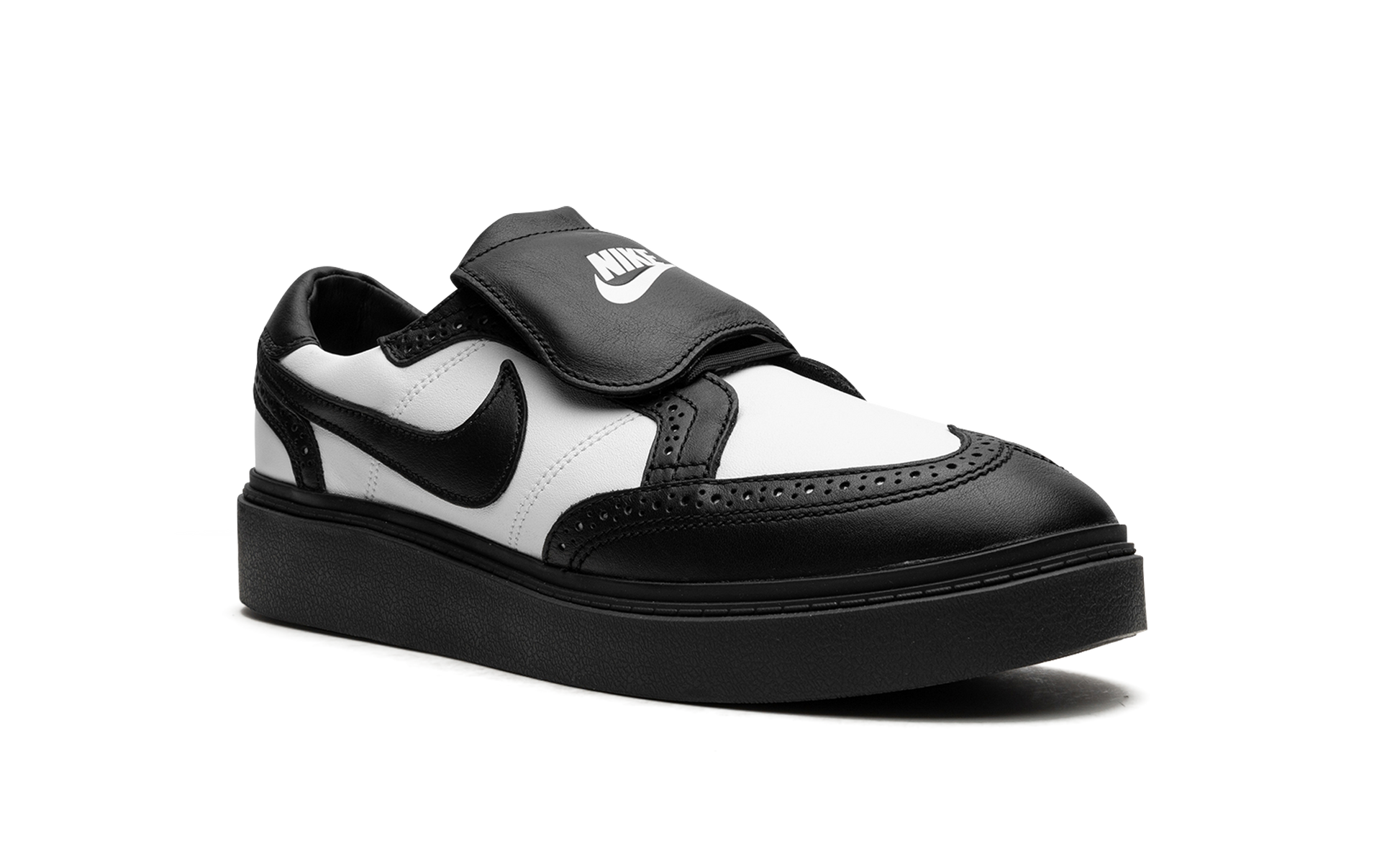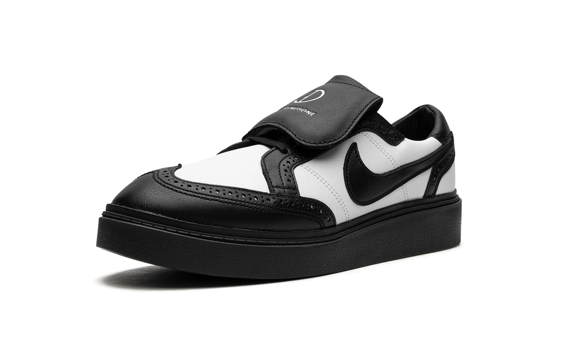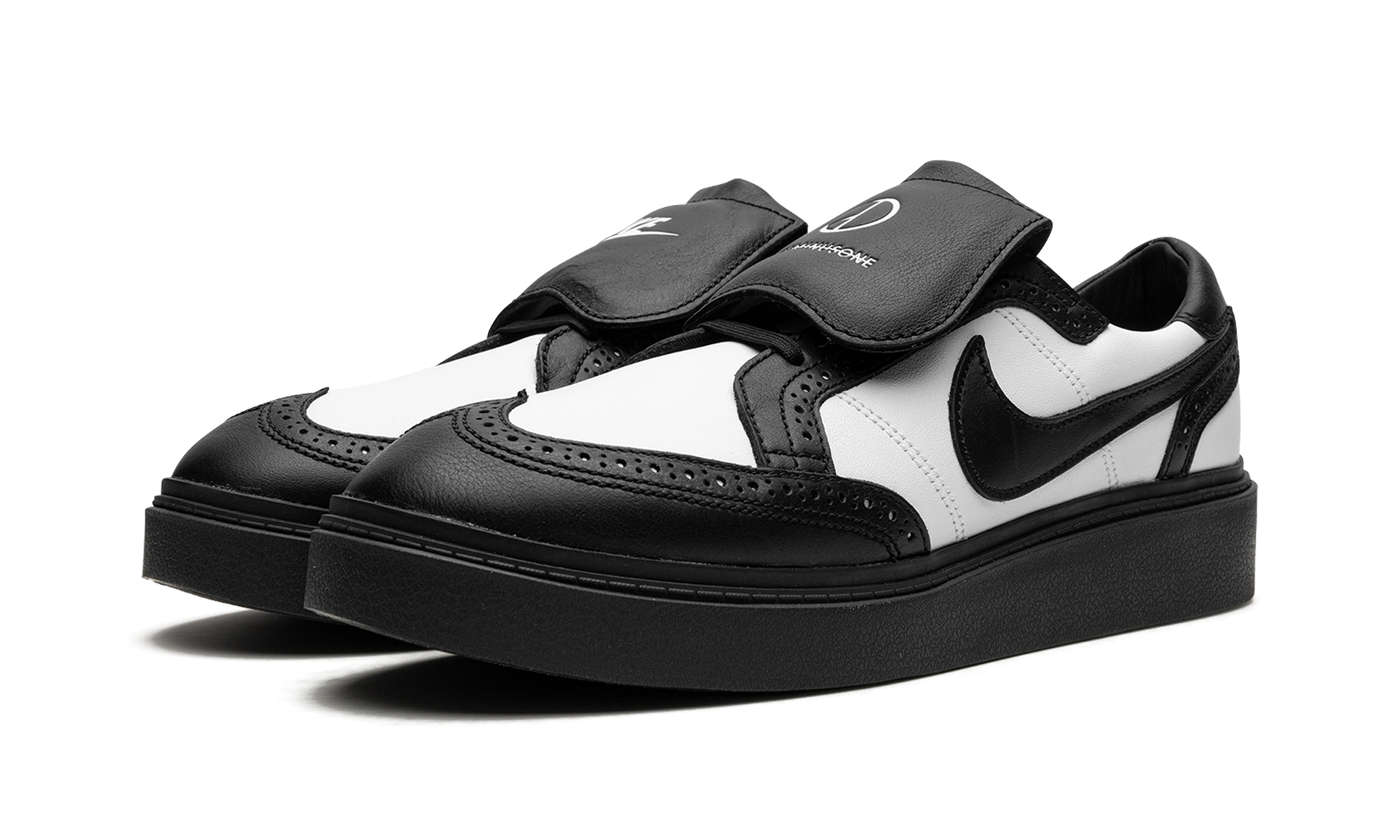 The G-Dragon x Nike Kwondo 1 “Panda” is a collaboration by the South Korean hip-hop artist and Nike on the brogue-style shoe that debuted in December 2021. The Nike Kwondo 1 is named after the Korean martial art of taekwondo, and its design is inspired by several footwear styles, most notably brogue-style dress shoes, Stefan Janoski’s Nike SB Janoski line, and ‘90s-era football cleats. This is evident from the perforations found along each panel, the overall shape of the shoe, and the overlapping tongues. As for the rest of the design, the shoe appears in a “Panda” inspired color block with white leather on the base and black leather on the overlays and on the Swoosh. Dual “Nike” and “Peaceminusone” logos are found on the left and right tongues, respectively. An embroidered daisy detail on the heel is a nod to G-Dragon’s logo. More classic, formal-looking footwear inspires the look of the shoe’s black rubber sole.