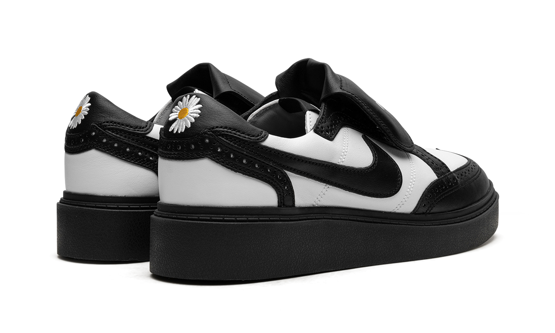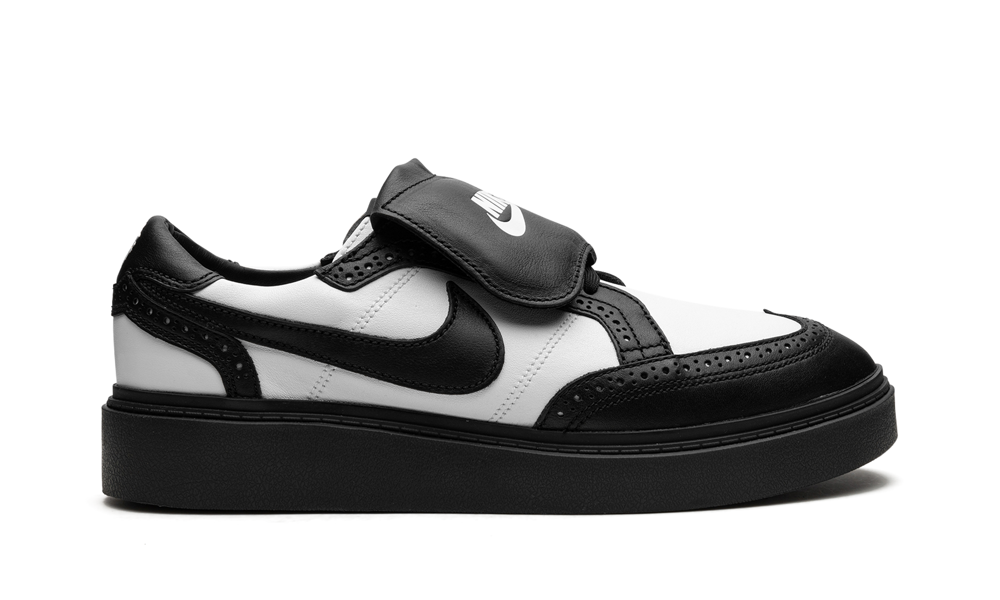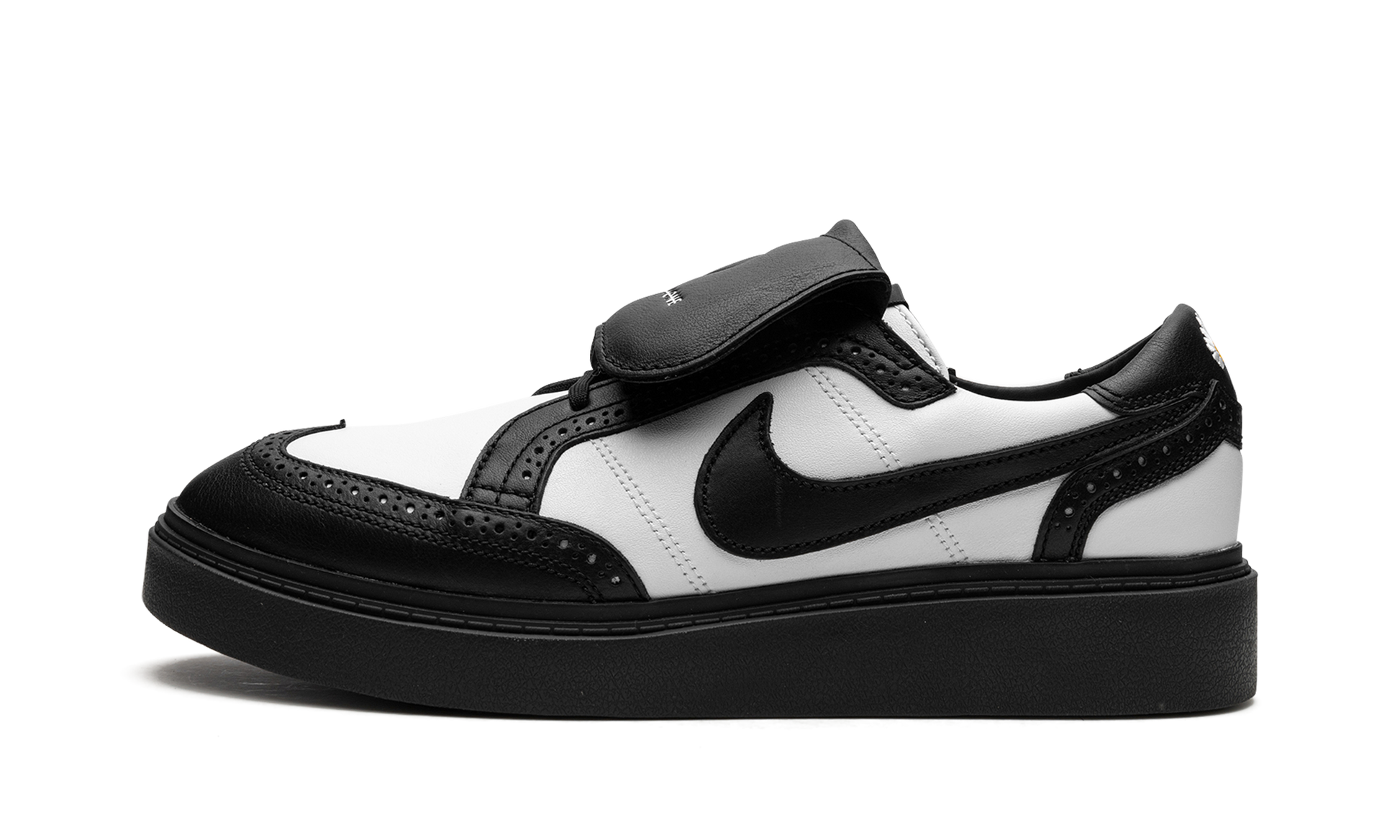 The G-Dragon x Nike Kwondo 1 “Panda” is a collaboration by the South Korean hip-hop artist and Nike on the brogue-style shoe that debuted in December 2021. The Nike Kwondo 1 is named after the Korean martial art of taekwondo, and its design is inspired by several footwear styles, most notably brogue-style dress shoes, Stefan Janoski’s Nike SB Janoski line, and ‘90s-era football cleats. This is evident from the perforations found along each panel, the overall shape of the shoe, and the overlapping tongues. As for the rest of the design, the shoe appears in a “Panda” inspired color block with white leather on the base and black leather on the overlays and on the Swoosh. Dual “Nike” and “Peaceminusone” logos are found on the left and right tongues, respectively. An embroidered daisy detail on the heel is a nod to G-Dragon’s logo. More classic, formal-looking footwear inspires the look of the shoe’s black rubber sole.
