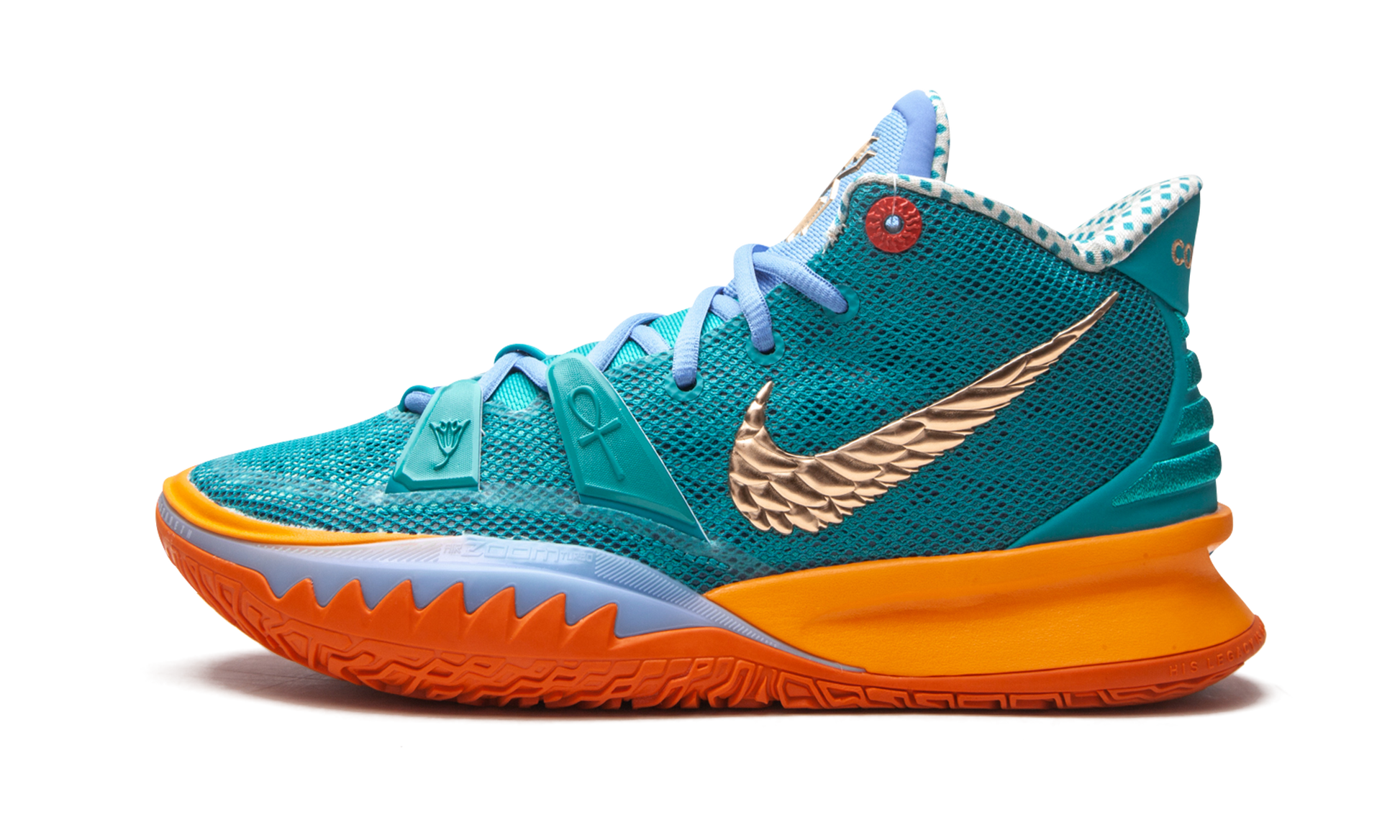 The Concepts x Nike Kyrie 7 “Horus” is a special edition collaboration between the Boston based sneaker boutique and Nike Basketball on Kyrie Irving’s seventh signature shoe in a colorway inspired by the ancient Egyptian god. A May 2021 release, the “Horus” channels the energy of previous Concepts x Nike Kyrie collaborations, notably the Egyptian-themed Nike Kyrie 5 and 6. The upper features an attention-grabbing teal mesh construction. An “Eye of the Ra” design appears on the medial side and a gold Swoosh appears on the lateral side of the shoe. Gold “Concepts” embroidery is stitched onto the heel. Dual “Kyrie Irving” and “Concepts” branding can be found on the light blue mesh tongue of the left and right shoe, respectively. An icy blue semi-translucent panel appears on the lateral side of the forefoot of the orange foam midsole. Release date: May 19, 2021.