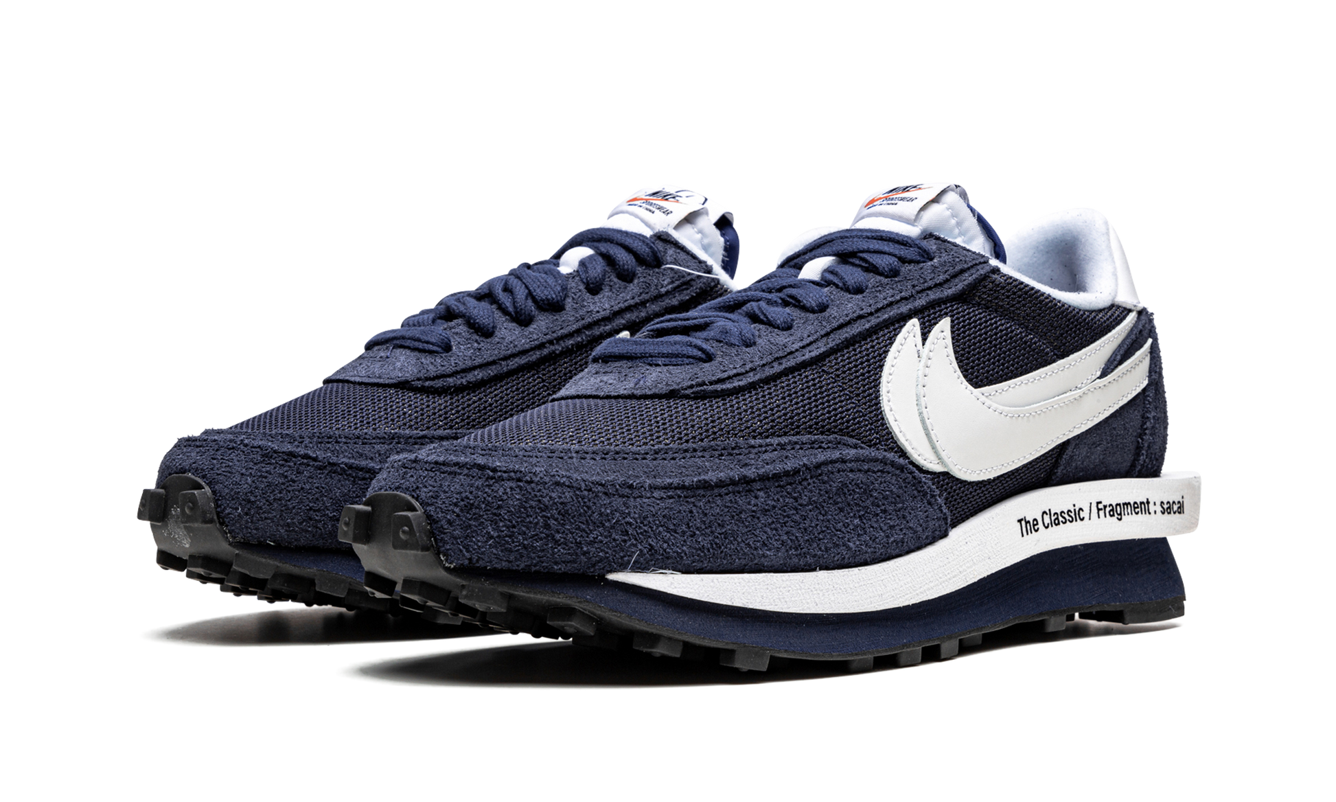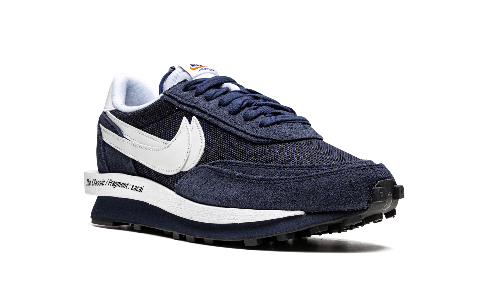 The Fragment x Sacai x Nike LDWaffle “Blackened Blue” is a yet another chapter in the three-way collaboration between Hiroshi Fujiwara and Chitose Abe’s clothing brands and Nike on the hybrid shoe. The “Blackened Blue” is one of multiple colorways of the fusion shoe that combines elements of the Nike LDV and Waffle Racer released by Fragment, Sacai, and Nike in 2021. Black mesh can be found on the base while Blue Void hairy suede appears on the overlays on the forefoot, eyelets, and heel. Two white leather Swooshes are layered over one another on either side. Dual Sacai and Nike branding is printed on the white leather heel tab. Two sets of navy blue laces are placed on top of the stacked tongues. The aforementioned design elements are taken from the original Sacai x Nike LDWaffle. Text reading “The Classic / Fragment : sacai” is printed on the white foam midsole. Release date: August 27, 2021