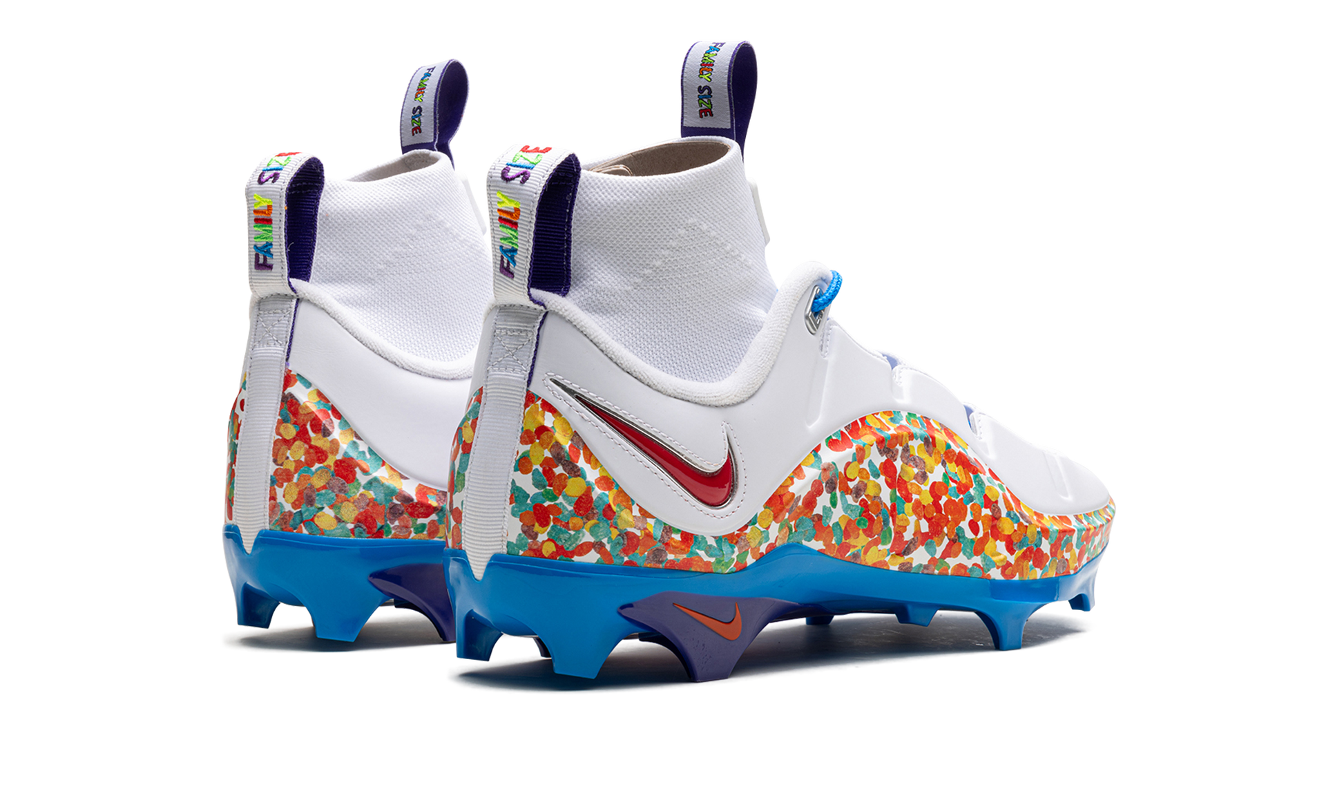 The Nike LeBron 4 Menace "Fruity Pebbles" is the cleated version of LeBron James’s fourth signature shoe with Nike Basketball in the famed cereal-inspired colorway. After gifting Cincinnati Bengals star wide receiver Ja’Marr Chase a pair of the “Fruity Pebbles” Nike LeBron 4 Menace, the covetable cleat was given a proper retail release by Nike in 2024. The Nike LeBron 4 Menace “Fruity Pebbles” draws heavily from the original Nike LeBron 4 colorway of the same nickname, and is essentially a one-to-one remake of that shoe. The shoe is inspired by LeBron’s favorite cereal, fruity pebbles, and features a multicolor design inspired by the cereal on its mudguard. Underfoot, rubber spikes provide traction on grass surfaces. Release date: March 7, 2024