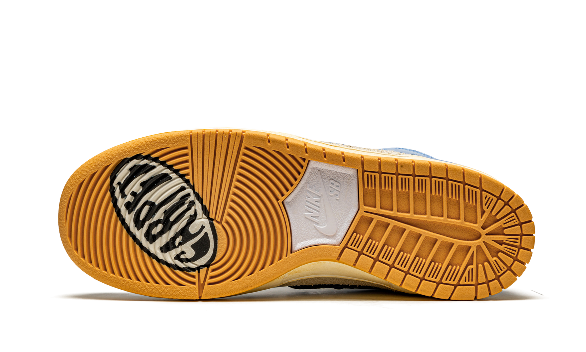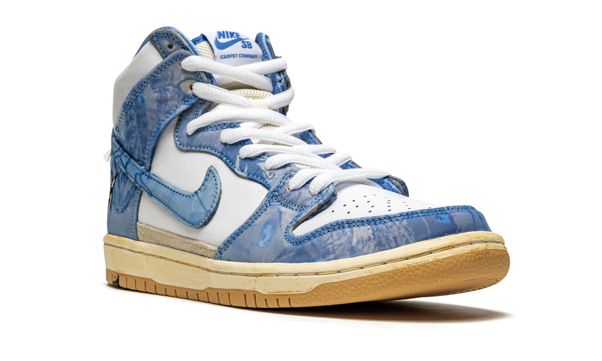 The Carpet Company x Nike SB Dunk High is a funky collaboration between the Baltimore based skateboard brand and Nike SB on the beloved skate shoe. In 2020, the Nike SB Dunk and standard Dunk recaptured their former glory and standing as some of the most playful and highly sought after shoes in Nike’s footwear collection. Due in no small part to the release of too-many-to name collaborations and returning “OG” colorways, both the skate-ready SB Dunk and lifestyle Dunk were the “it” shoes of the year. The momentum carried over in a big way in 2021 thanks to models like this Carpet Company design. White-and-blue bleached graphic overlays on the forefoot, eyelets, collar, heel, and Swoosh logo garner attention against the stark white leather base. The blue material can also be worn away or cut off to reveal another colorful graphic underneath. Carpet Company embroiders its “C” star motif on the heel and a small tan suede overlay appears on the bottom of the mid-panel above the intentionally-aged yellow midsole. A co-branded tongue tag is stitched on top of the white mesh tongue and the gum rubber outsole provides plenty in the way of grip for skateboarding. Release date: March 12, 2021.