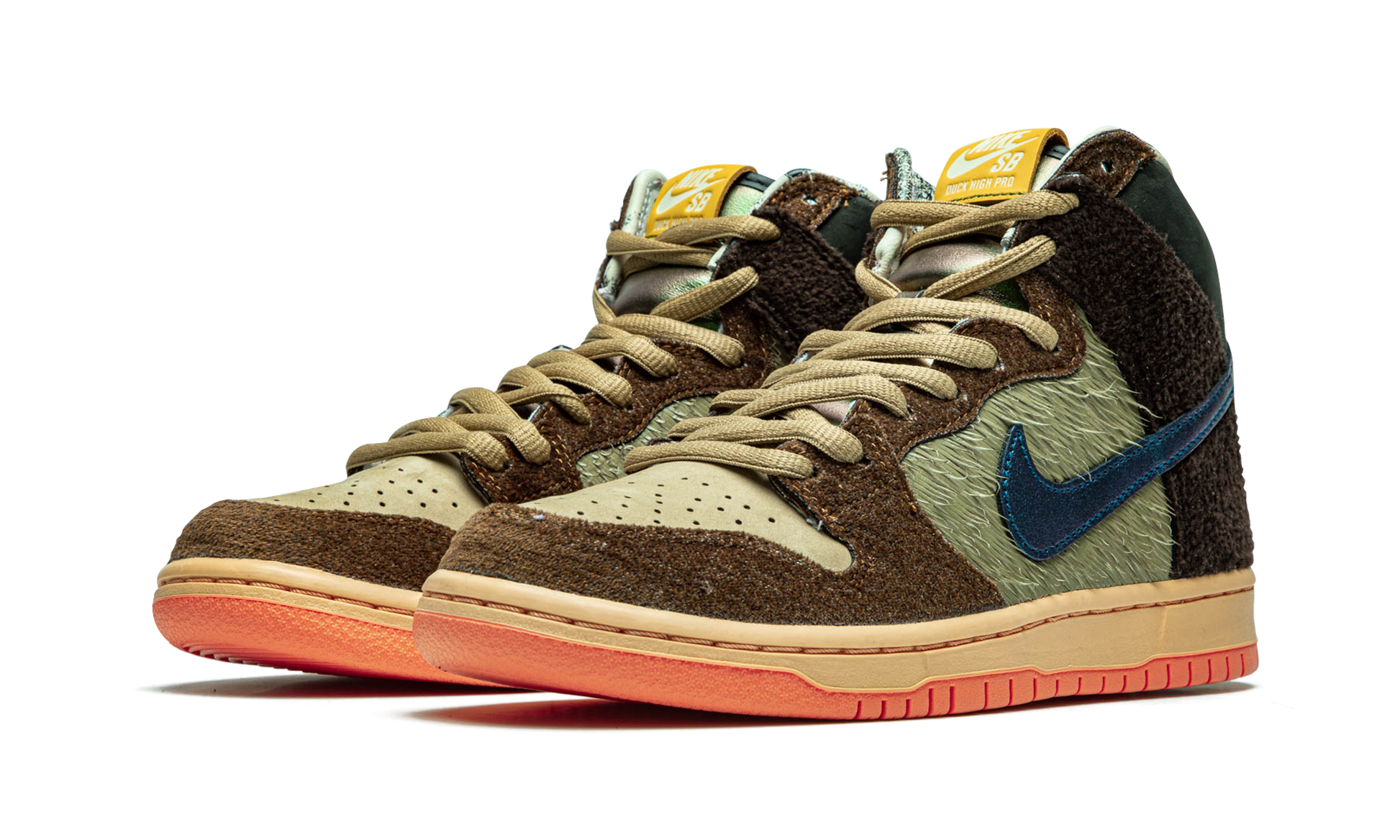 The Concepts x Nike SB Dunk High “Turdunken/Mallard” is a special collaboration cooked up by the Boston sneaker boutique and Nike SB on a Dunk for Thanksgiving and the Holidays. The wild look was described by Concept’s Creative Director Deon Point as being the shop’s “most off-the-wall thing we’ve ever done,” high praise coming from the man who had a hand in coming up with the design of luminaries like the “Lobster” SB Dunks and more. Inspired by the popular holiday dish of turducken, which is both a chicken and duck stuffed inside of a turkey, the “Turdunken” is also based on the mallard duck. Nods to the waterfowl include an iridescent blue and green Swoosh that sit on top of a leather textured material meant to look like feathers. Suede detailing on the heel mimics duck down. Additional tongue-in-cheek overtures to the mallard duck include an orange sole to represent its legs and feet and a toile print on the insole and collar lining displaying a flock of mallards. This listing is for the standard box version of the Concepts x Nike Dunk Low “Turdunken.” Release date: November 14, 2020.