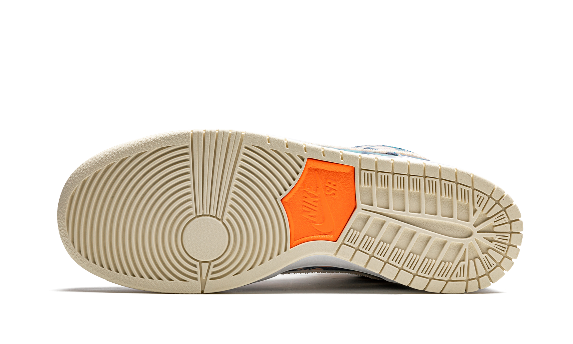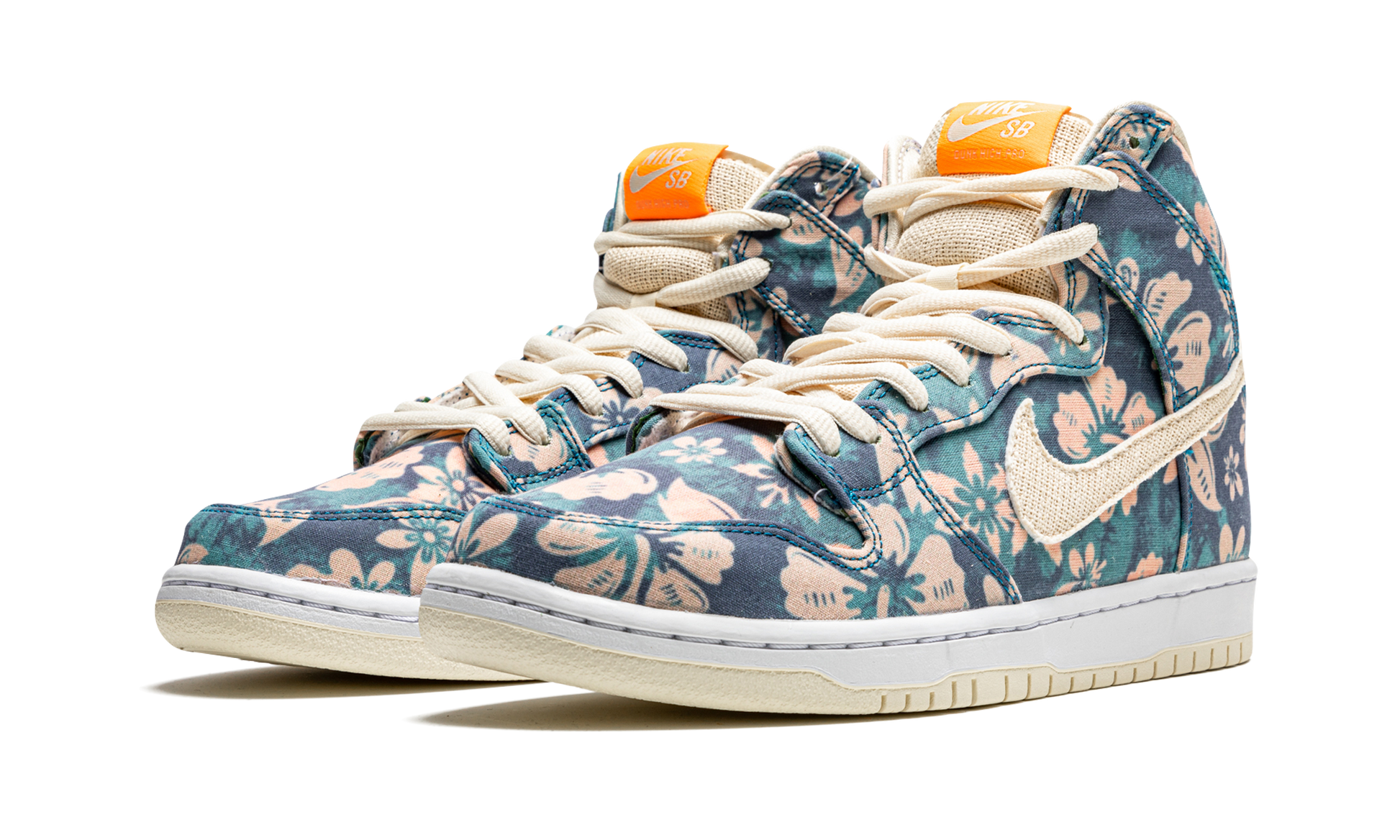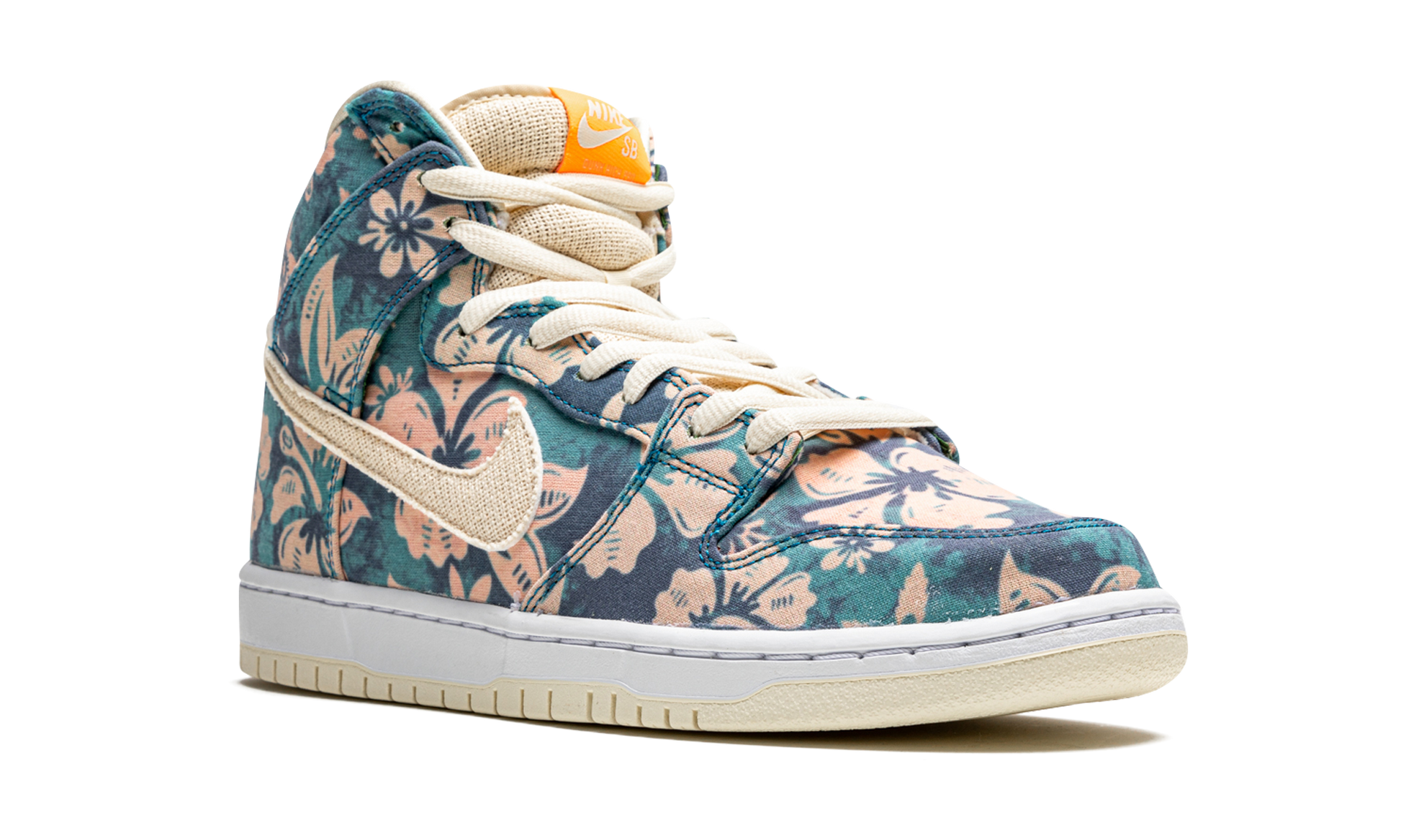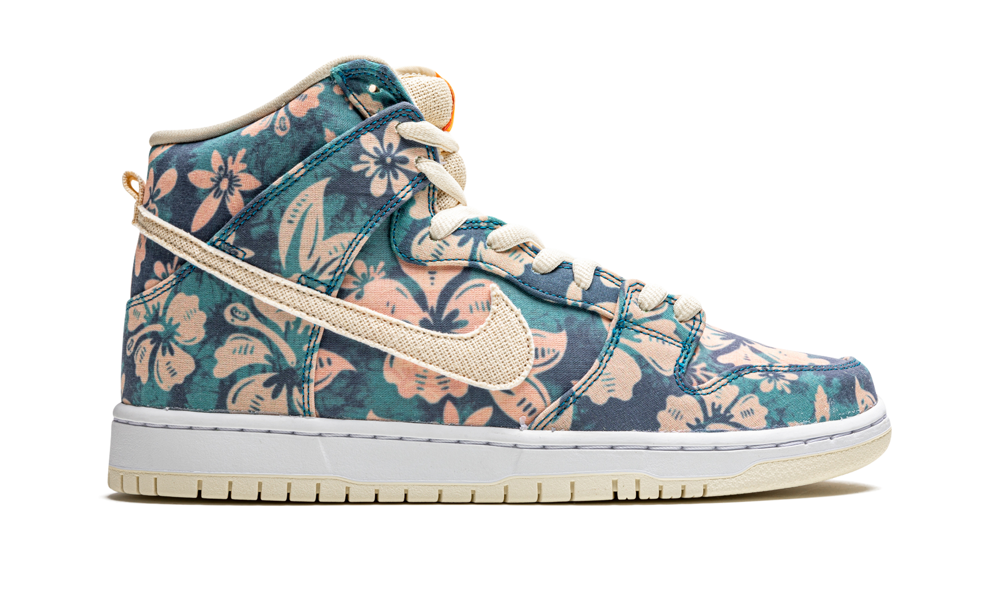 The Nike SB Dunk High Pro “Hawaii” is a special edition colorway of the skate shoe that continued Nike SB’s annual 4/20 themed sneaker releases in April 2021. Also known as the “Maui Wowie,” a reference to the strain of marijuana that’s grown in Hawaii, this colorful SB Dunk High is one of the latest models to honor the state of Hawaii. Nike SB released the “Aloha” in collaboration with Kicks Hawaii in 2004 and a volcano-themed SB Dunk Low called the “Hawaii” in 2006. As for the design of this shoe, a breezy blue Hawaiian print forms the base. A hidden hairy green suede material is revealed on the overlays on the forefoot, collar, and heel when the Hawaiian print textile is worn or torn off. An orange Hawaiian print is lies beneath the exterior of the perforated toe, mid-panel, and collar. The wear-away theme has been used on past Nike SB 4/20 themed releases, including on the “Cheech & Chong” SB Dunk High from 2011. Both the Swoosh branding and the tongue are constructed from a durable hemp material. White “Nike SB” insignia can be found on the orange nylon tongue tag. Zoom Air cushioning technology is added to the heel of the insole to provide a responsive ride whether on or off a skateboard. Release date: April 20, 2021.