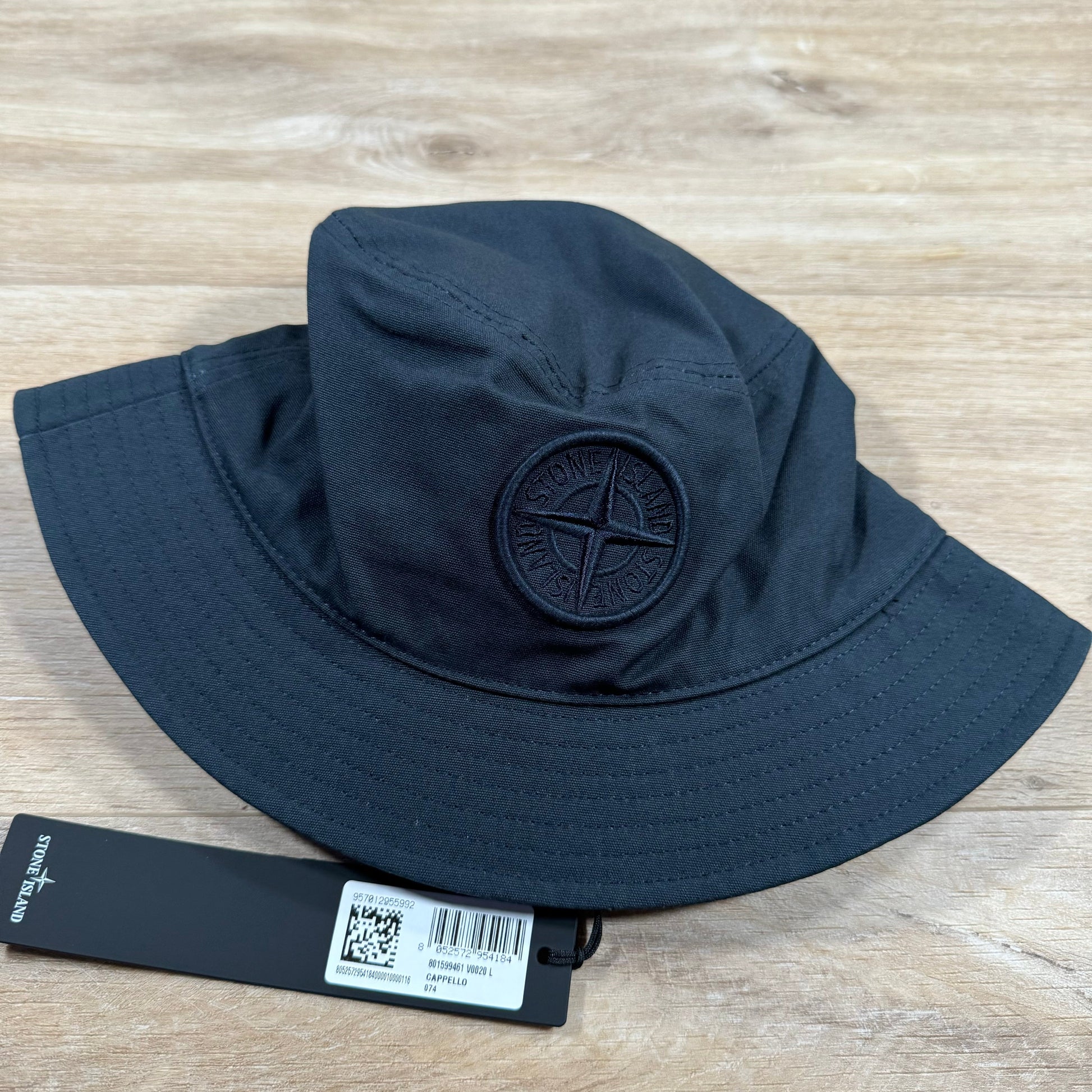 Stone Island bucket hat in cotton rep. Raised embroidered Compass logo on the crown. Inner contour band in cotton twill. Lined in navy cotton.