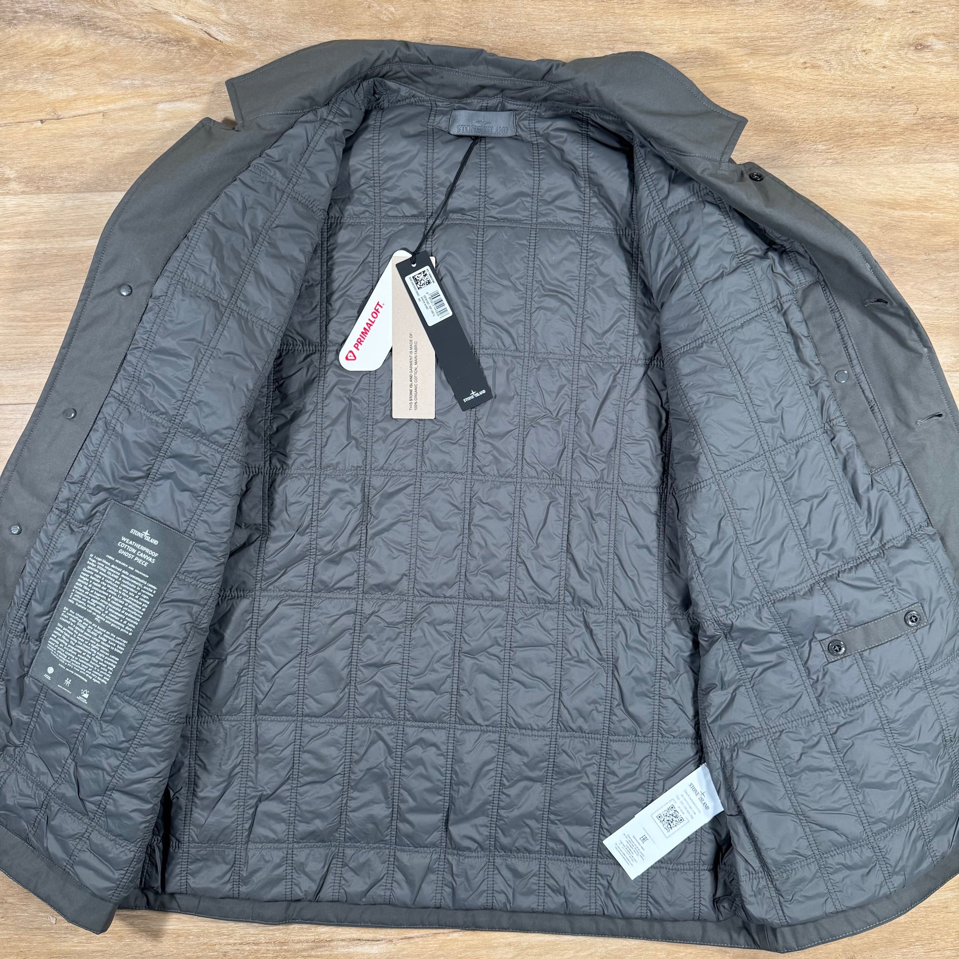 Ghost blazer in tightly woven organic cotton canvas, made from long-staple fibres for durability, breathability, and natural weather resistance without added coatings. Entirely natural and comfortable, it features a quilted PrimaLoft® lining for warmth, a snap at the neck, standing hand pockets with flaps and concealed snaps, and an inner pocket with snap visible from the outside. Finished with tightening snaps at the cuffs, a concealed button placket, and the tonal Stone Island Ghost badge on the sleeve.