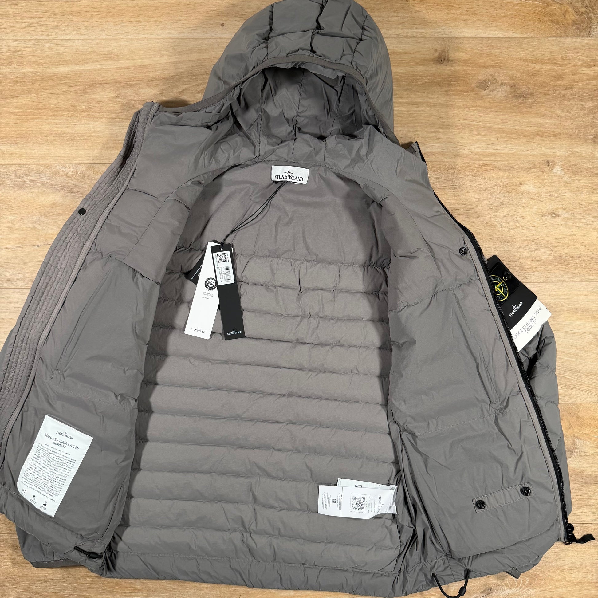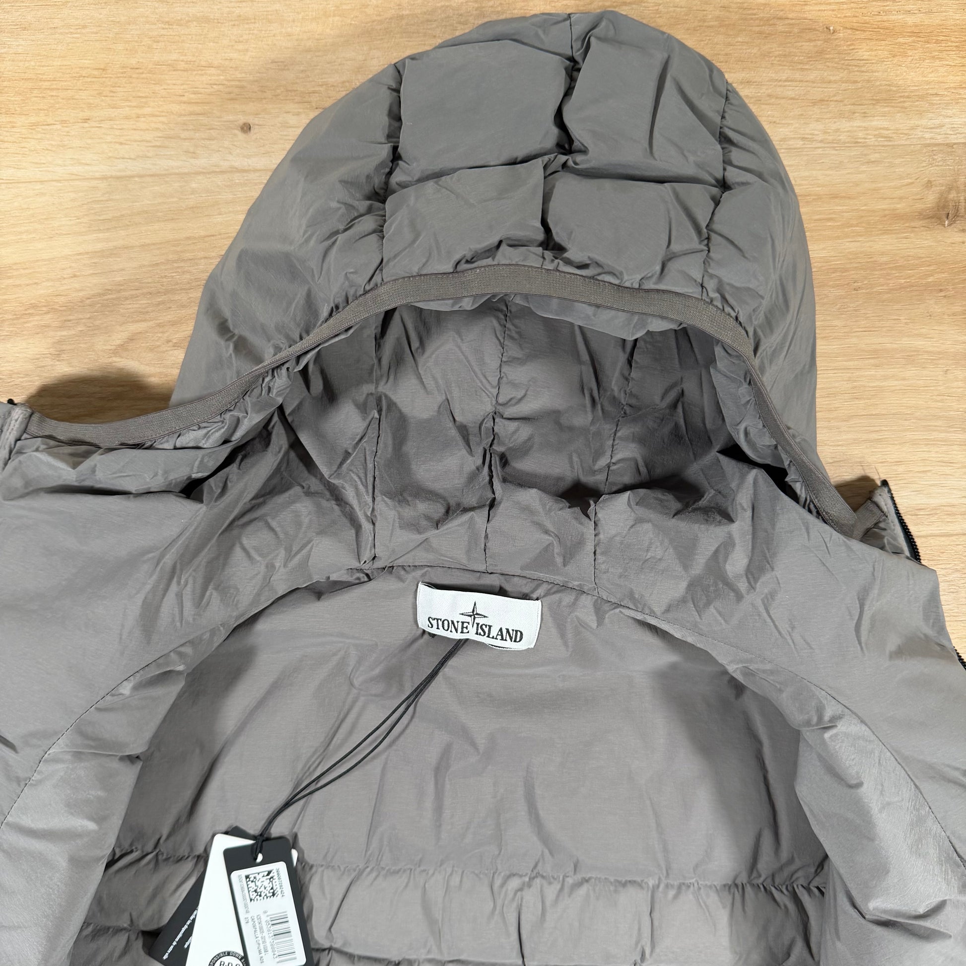 Hooded down jacket in a light single-layer stretch fabric made with 86% recycled nylon, woven with a special technique that creates feather compartments directly from the loom. Features a padded hood with elasticated trim, chest and hand pockets with invisible zips, and a flat back yoke. Finished with elasticated cuffs, a drawcord hem, the Stone Island badge on the sleeve, and a hidden two-way zip fastening with an inner snap placket.