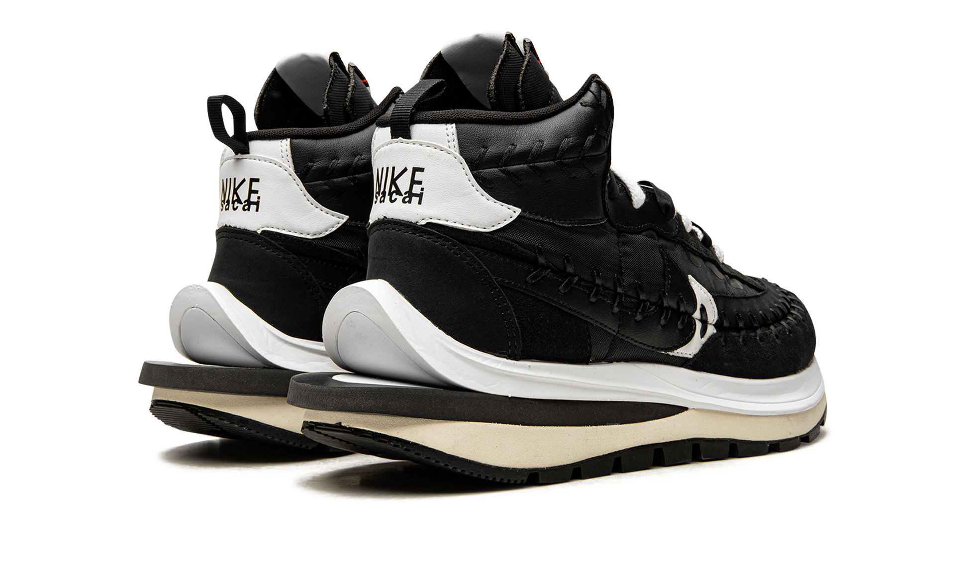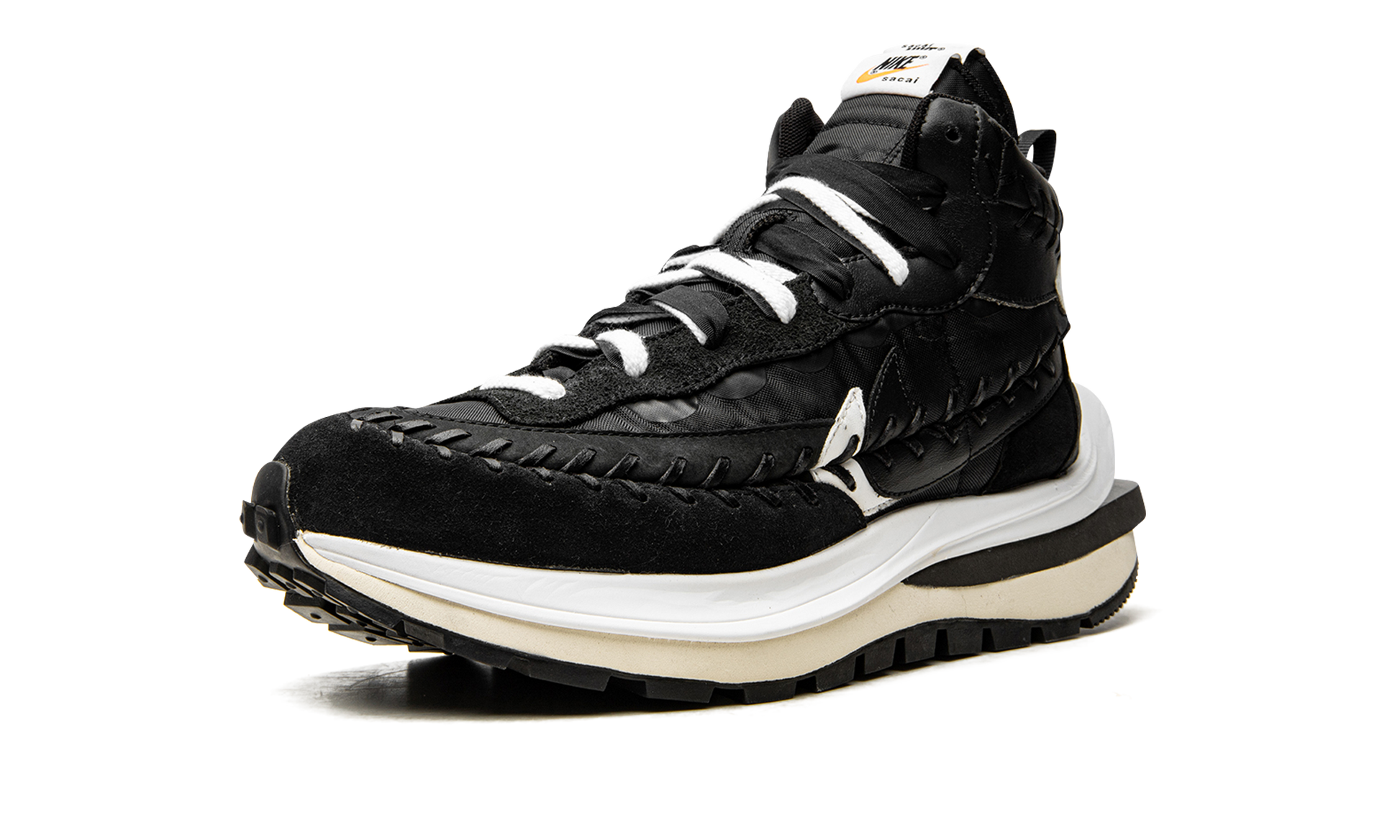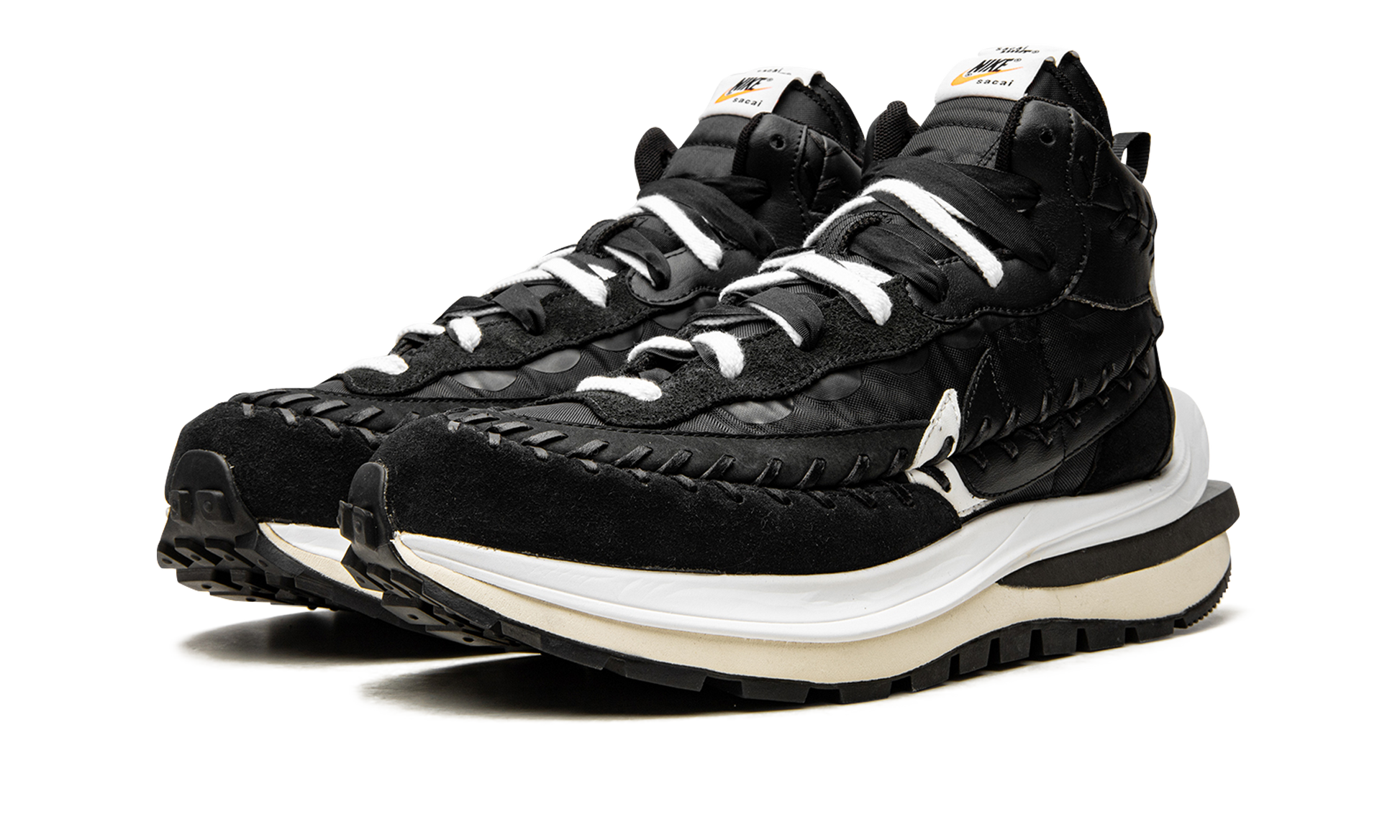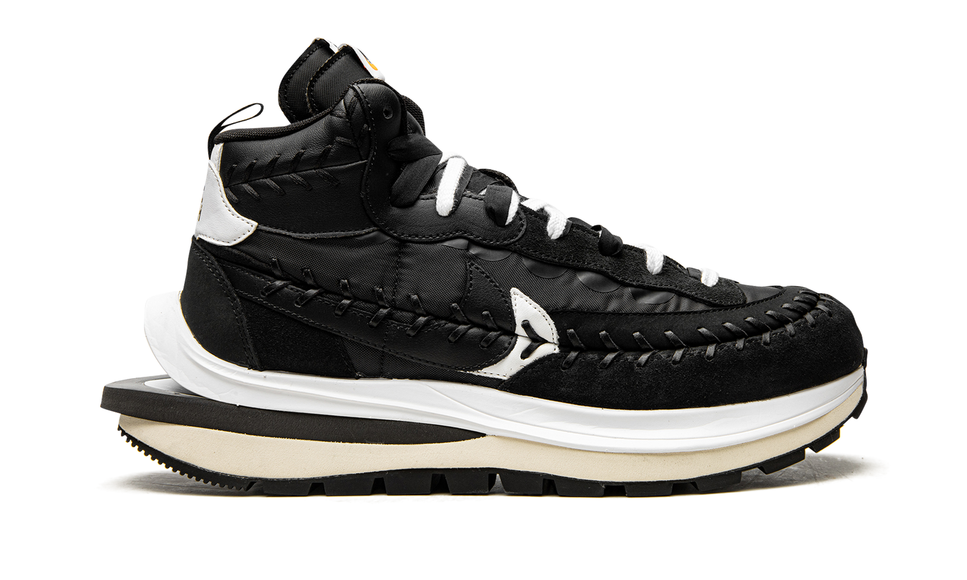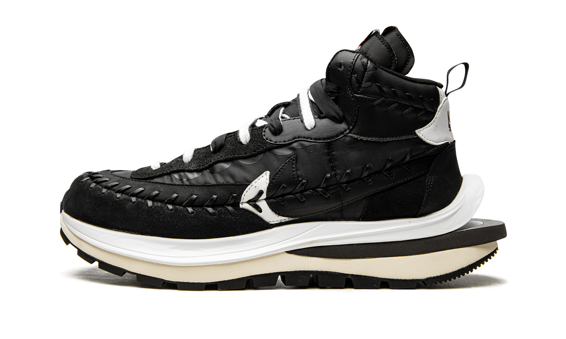 The Sacai x Jean Paul Gaultier x Nike VaporWaffle “Black” is a collaboration between Chitose Abe’s high fashion brand, the storied French fashion house, and Nike on the hybrid shoe that fuses elements of Nike’s VaporFly and Pegasus styles. One of two launch colorways of the model, the “Black” arrives in a high-top silhouette, a departure from Sacai and Nike’s previous VaporWaffle collaborations. Moreover, the shoe features a new design that includes baseball-style stitching on the midfoot and collar. The same layered look that fuels Sacai and Nike’s previous VaporWaffle collaborations once again appears on this shoe, meaning two sets of eyelets, tongues, laces, and Swooshes give the design a modern look. Underfoot, a double-stacked white and cream foam sole completes the look.