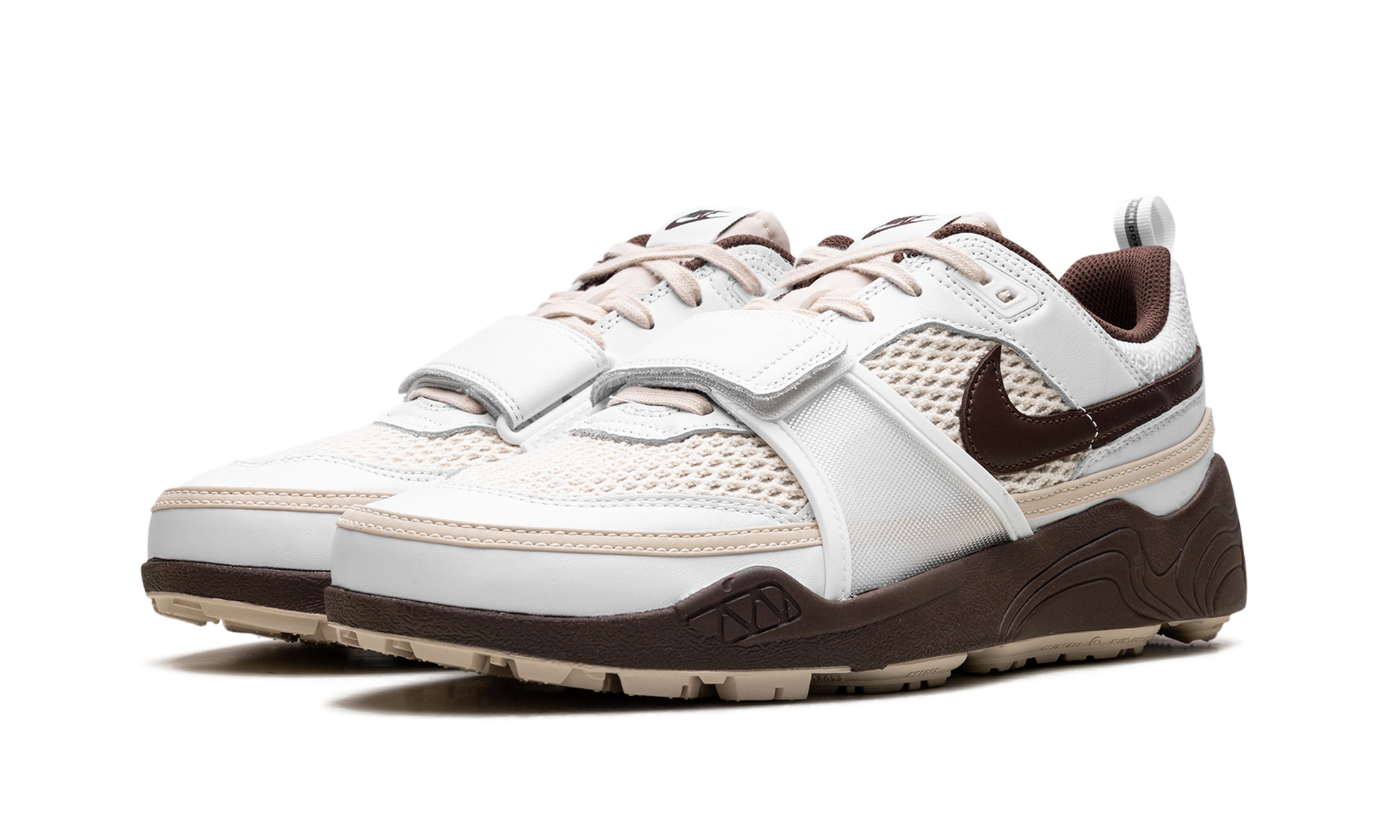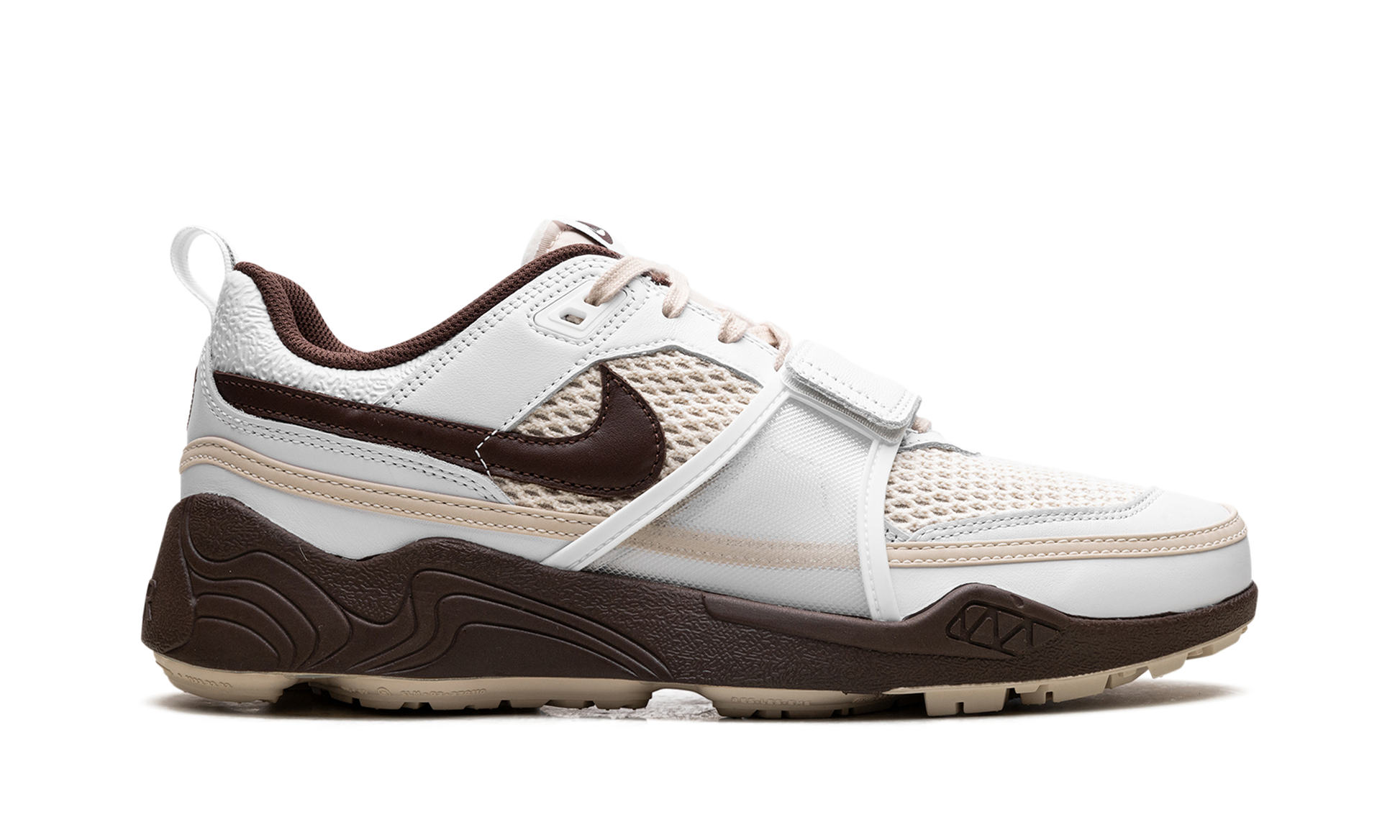 The Travis Scott x Nike Zoom Field Jaxx "Light Chocolate" continues La Flame's legacy as a sneaker designer. The training-inspired Zoom Field Jaxx has a midfoot strap similar to classic Nike cross trainers and a midsole that incorporates details from the Nike Zoom Spiridon as well as mesh panels on the upper. The white and brown colorway is reminiscent of other earth-toned Travis Scott sneakers. Cactus Jack logos appear on the heel and the medial side of the upper.